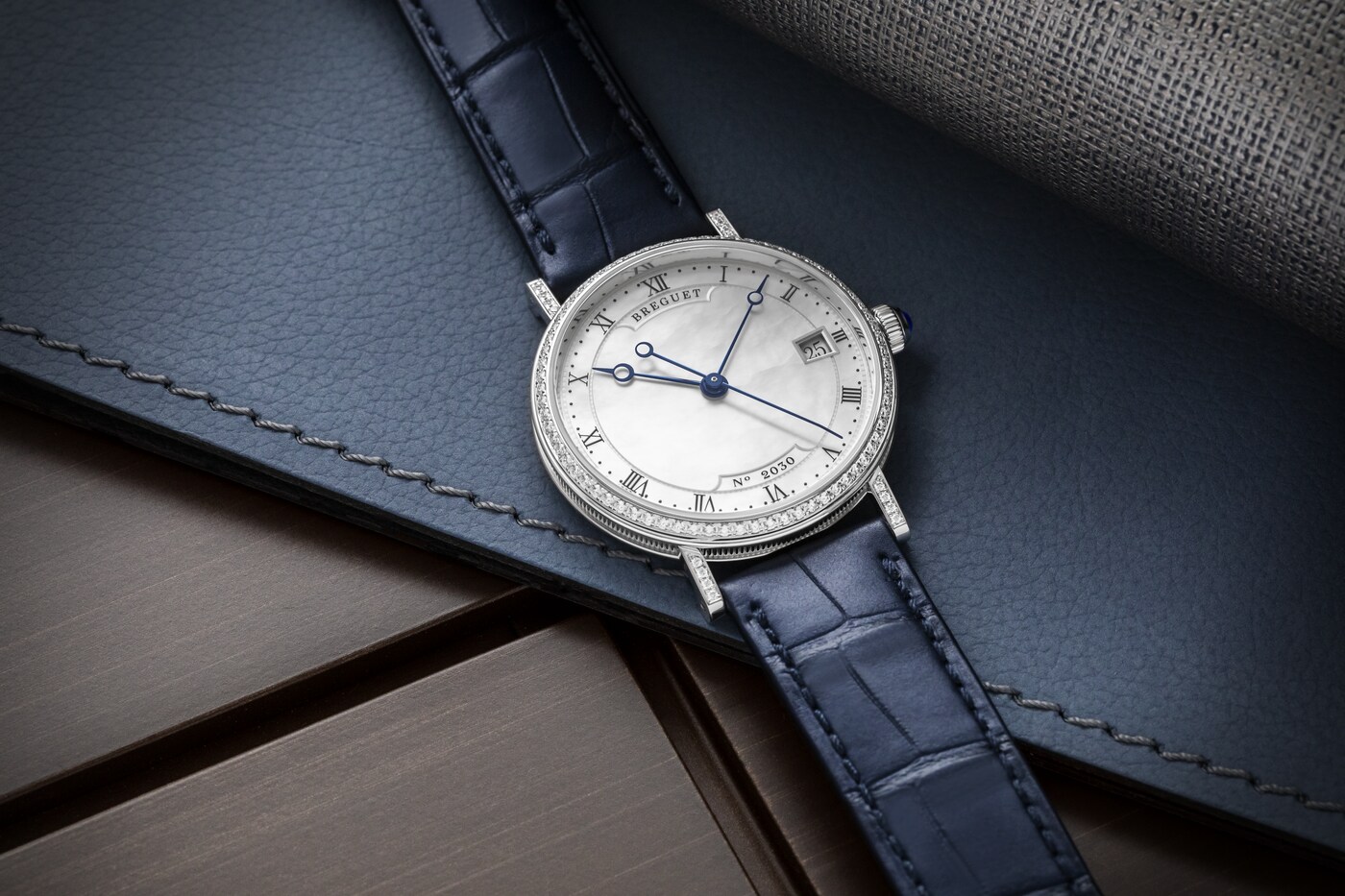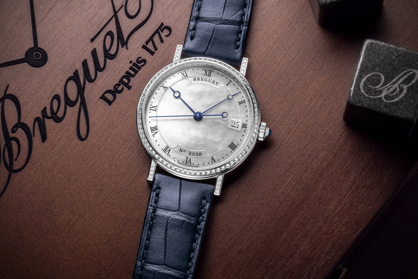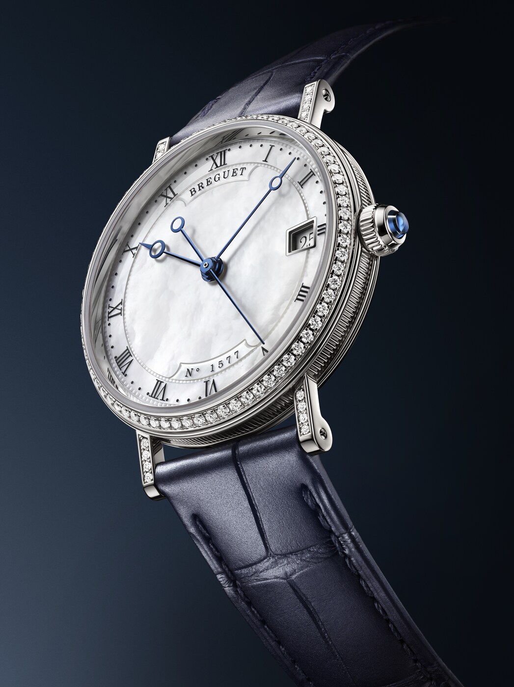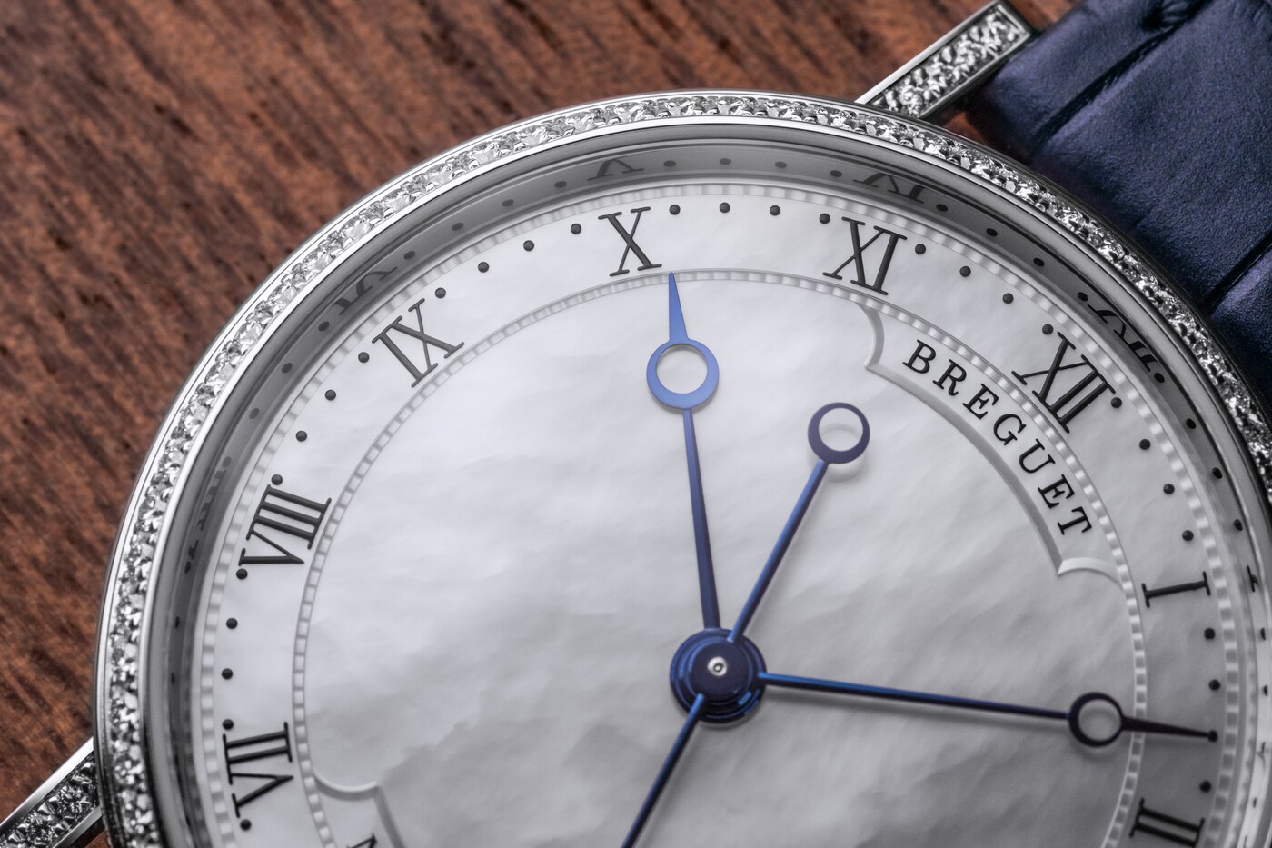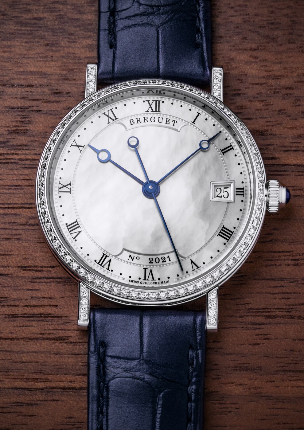 ブレゲはこの33.5mmのモデルに多くのバリエーションを用意しています。ホワイトまたはローズゴールド製ケースを備えた文字盤には、ホワイトナチュラルマザーオブパールまたは「クル・ド・パリ」模様のギヨシェ彫りが採用されています。またベゼルとラグにダイヤモンドをセッティングを施し鮮やかに仕上げらたモデルもあります。