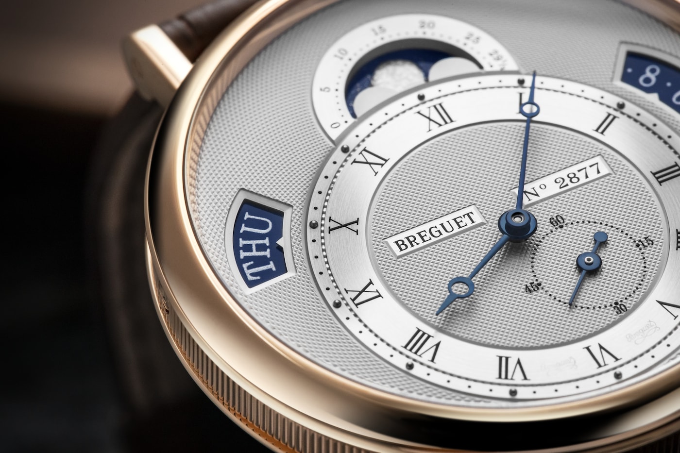6時側のオフセンターに配されたチャプターリングはタイムレスな「アップルハンド」のブレゲ針を備え、ラッカー仕上げの空に手作業で立体的に仕上げた月を重ねたムーンフェイズが配されています。10時と2時位置の2つの窓は曜日と日付を示しています。このタイムピースは極薄型キャリバーを搭載しており、そのゴールド製ローターには手作業でギヨシェ彫りが施されています。