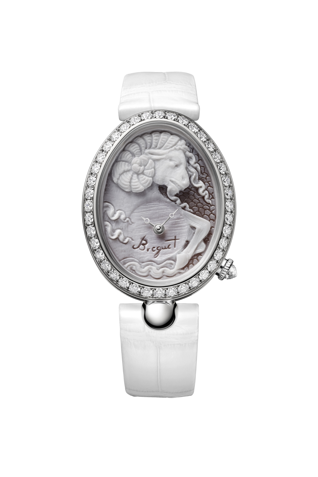 Chacune des Reine de Naples 8958 se dédie à l’expression d’un ou plusieurs métiers d’art. Outre le gravage ou l’émaillage, un des modèles met à l’honneur l’art du camée. Cette technique consiste en la gravure de coquillages présentant des strates de couleur contrastées. L’artisan travaille les couches intérieures d’à peine quelques millimètres d’épaisseur jusqu’à obtenir une délicate sculpture. Chaque réalisation est renfermée dans une boîte ovoïde, une des caractéristiques principales de la collection Reine de Naples.