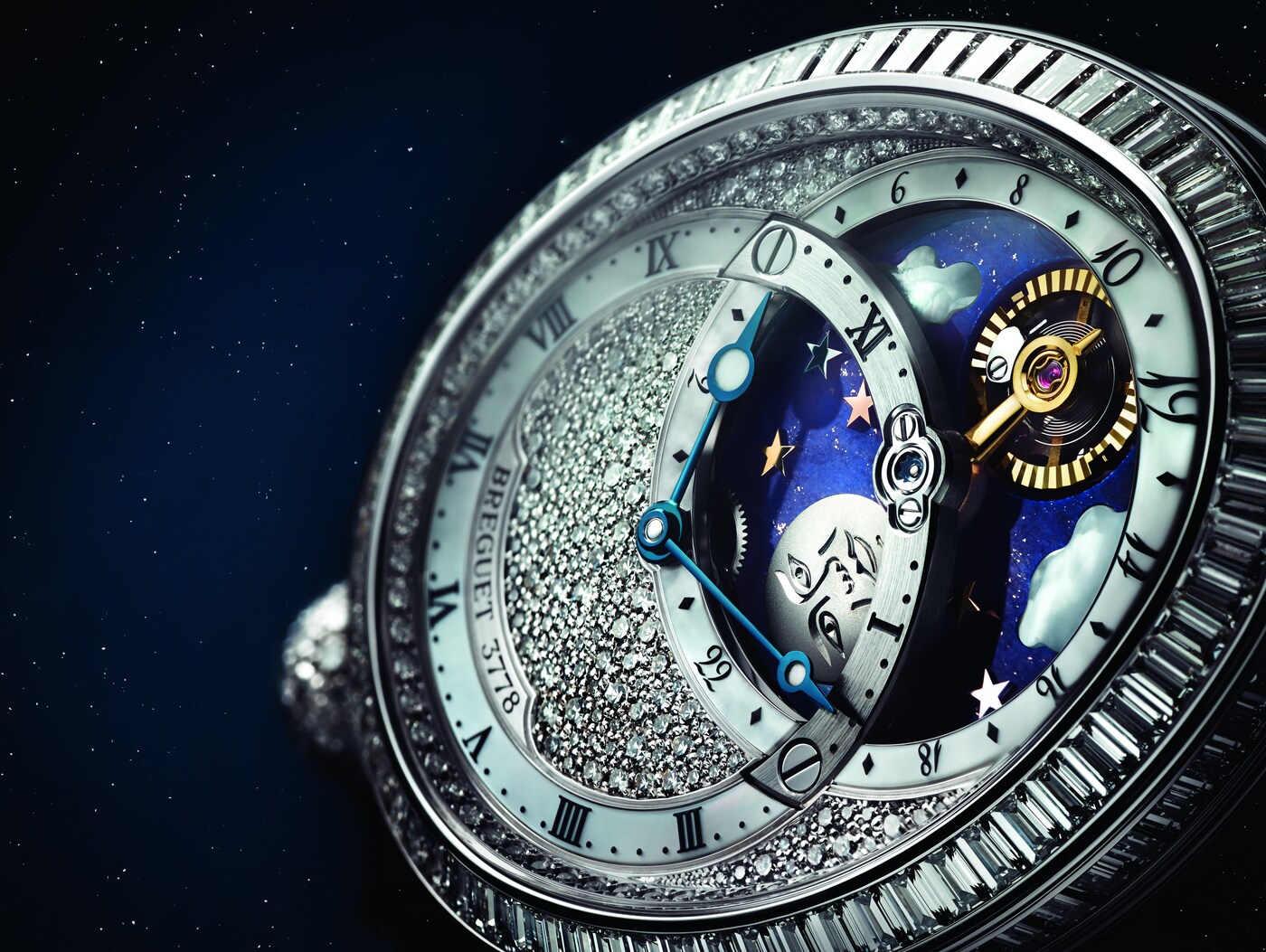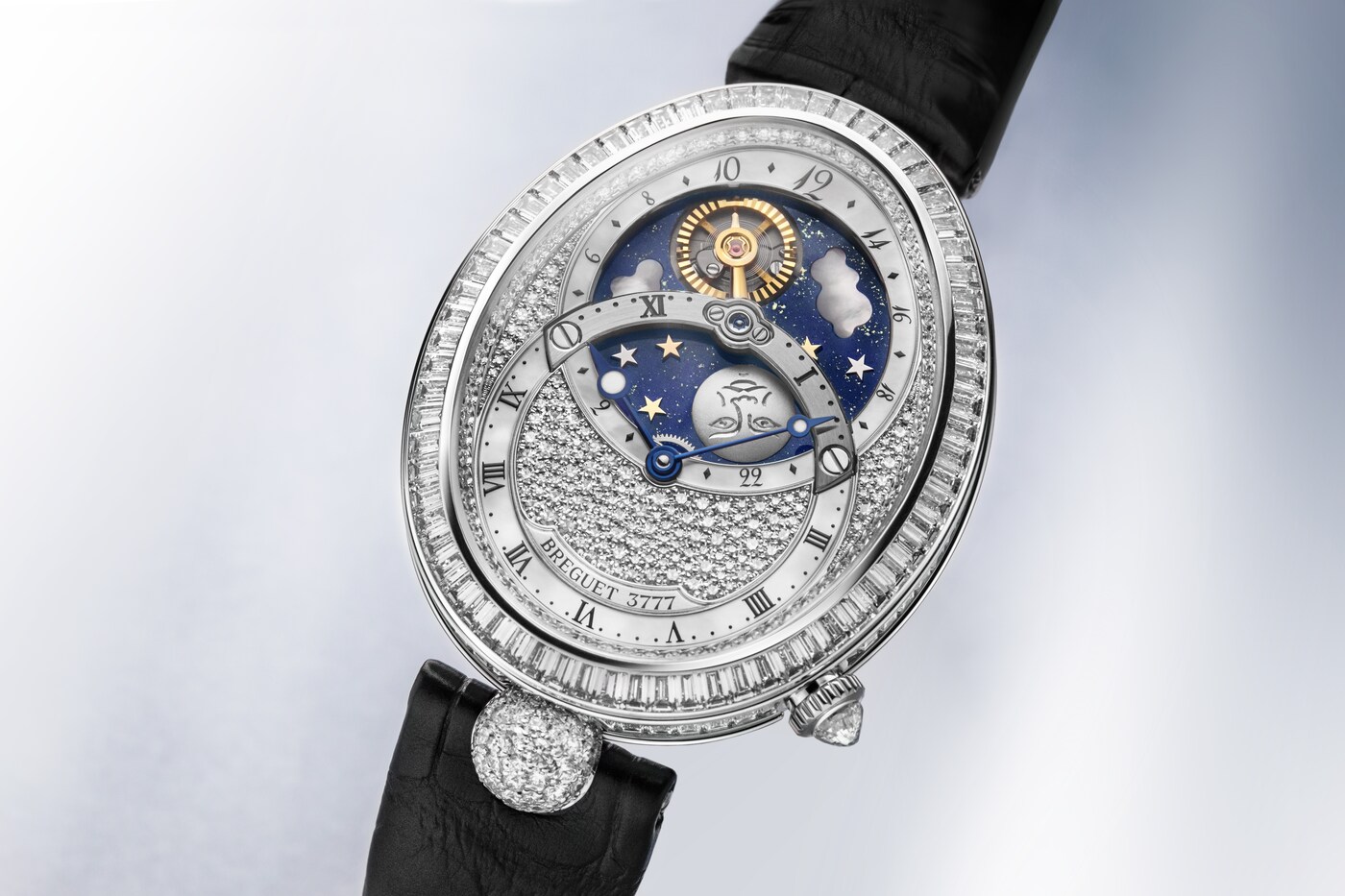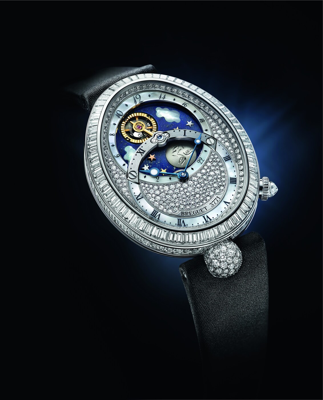 ブレゲの卓越したメカニズムが、「クイーン・オブ・ネイプルズ」コレクションのために特別に設計されたムーブメントに宿ります。このモデルには、時間・分を表示するダイヤルに加え、デイ/ナイト表示が詩的な表現で描かれた2つ目のダイヤルがあります。