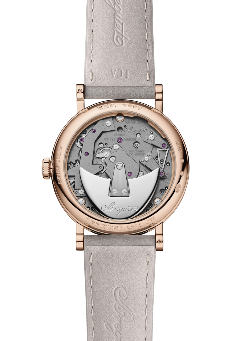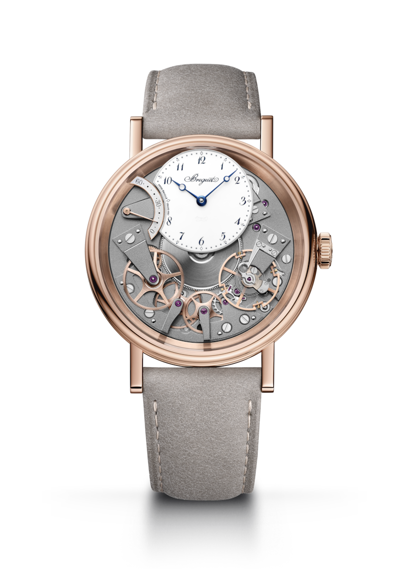 完全にシンメトリーなこの時計は、紛れもなく「トラディション」コレクションの一員であることを証明しています。通常であれば文字盤の下に隠されている、ブリッジ、歯車、脱進機、香箱、その他のムーブメントの部品はここでは地板の上で見えるように配されています。このモデルのもう1つの重要な機構は、4時位置に配された「パラシュート」機構。ブレゲが発明したこの機構はテンプの軸を衝撃から守ります。パラシュートは、現代の「インカブロック」をはじめとするあらゆる衝撃防止機構の先駆けです。