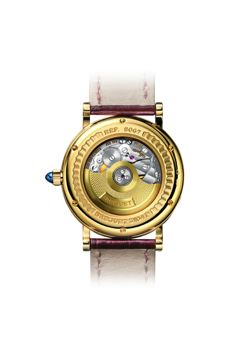 30mm 케이스에는 화이트 천연 머더 오브 펄과 로즈 엔진 위 수공 인그레이빙한 다이얼이 탑재되었으며, 그 위에 전통적인 브레게 핸즈가 장식되어 있습니다.
