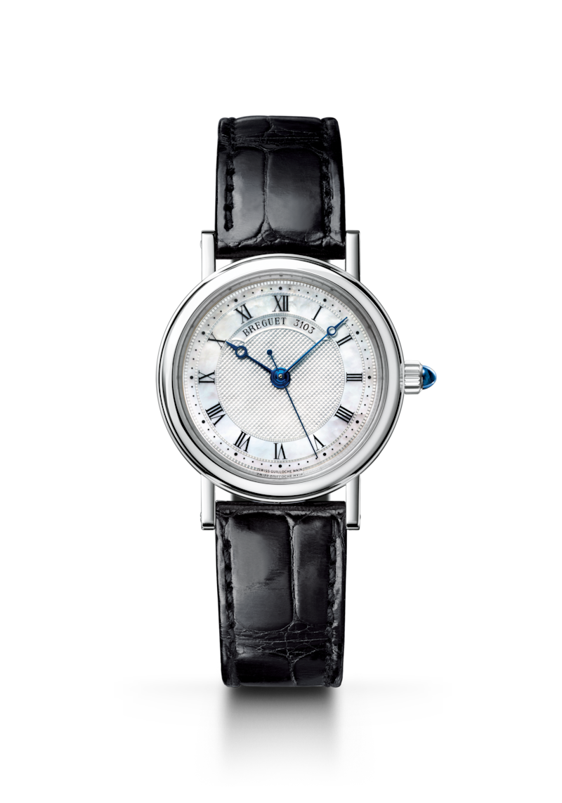 30mm 케이스에는 화이트 천연 머더 오브 펄과 로즈 엔진 위 수공 인그레이빙한 다이얼이 탑재되었으며, 그 위에 전통적인 브레게 핸즈가 장식되어 있습니다.