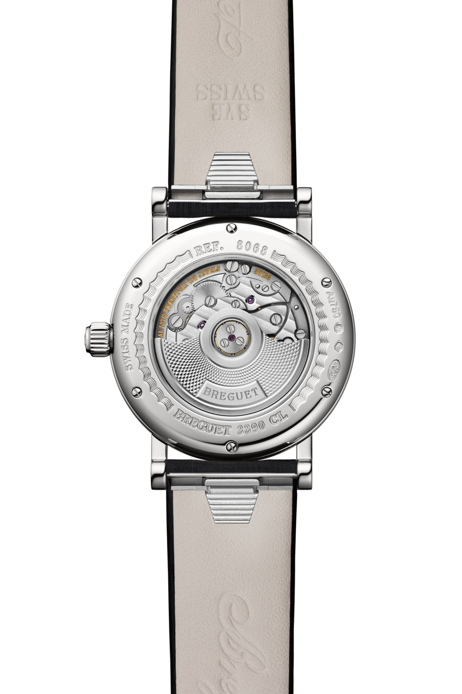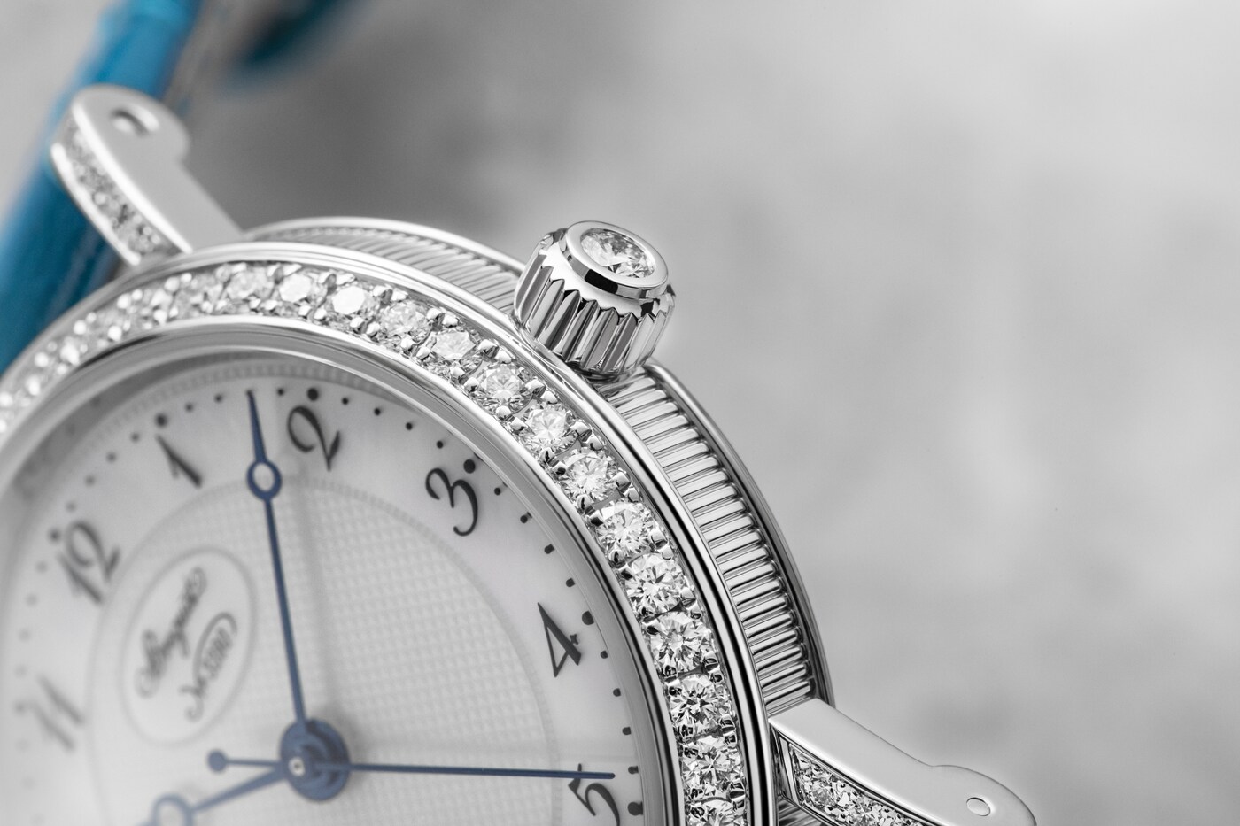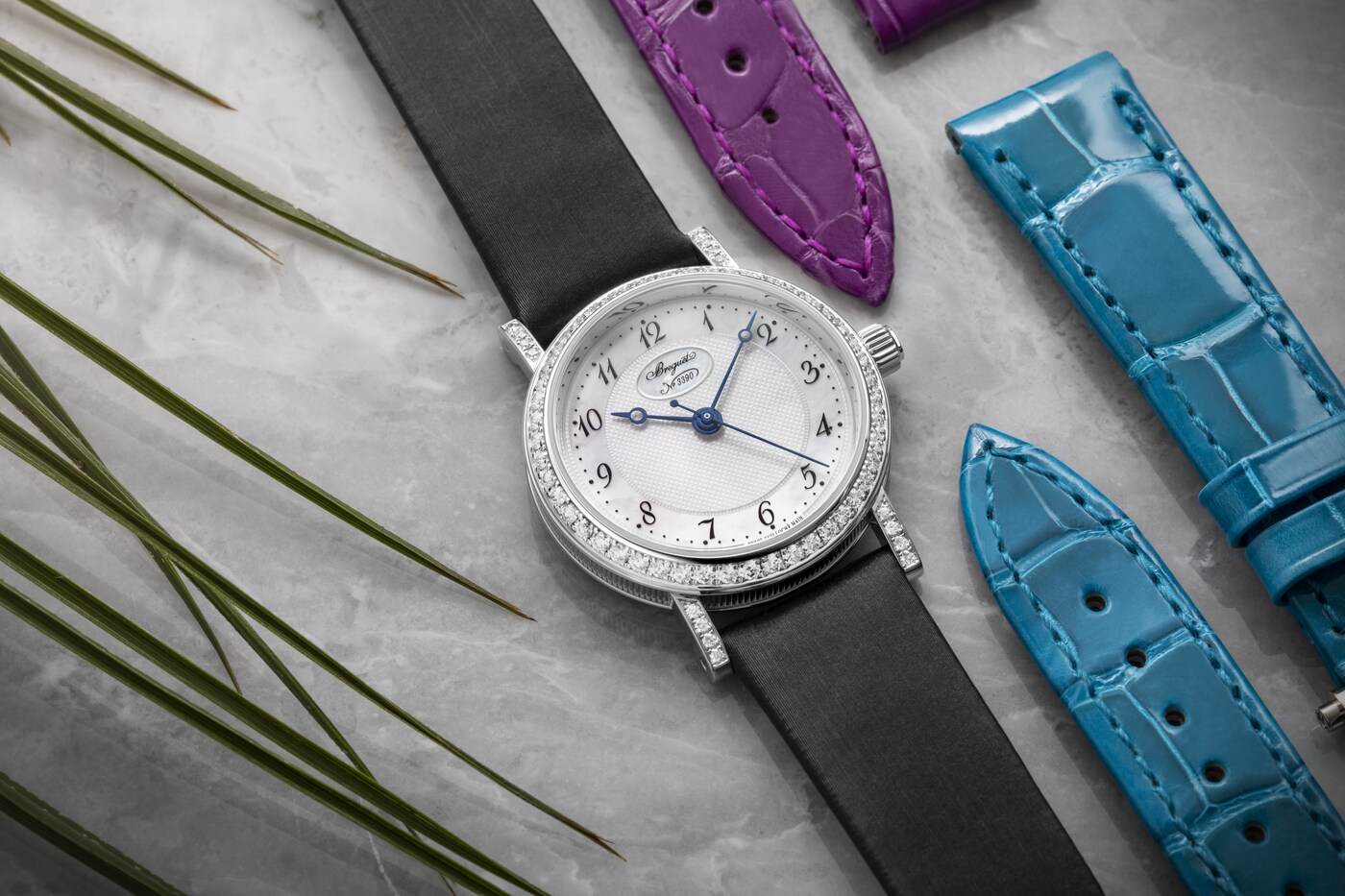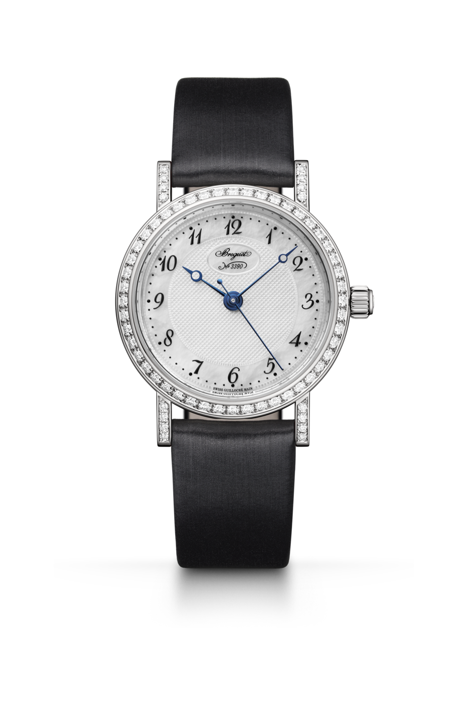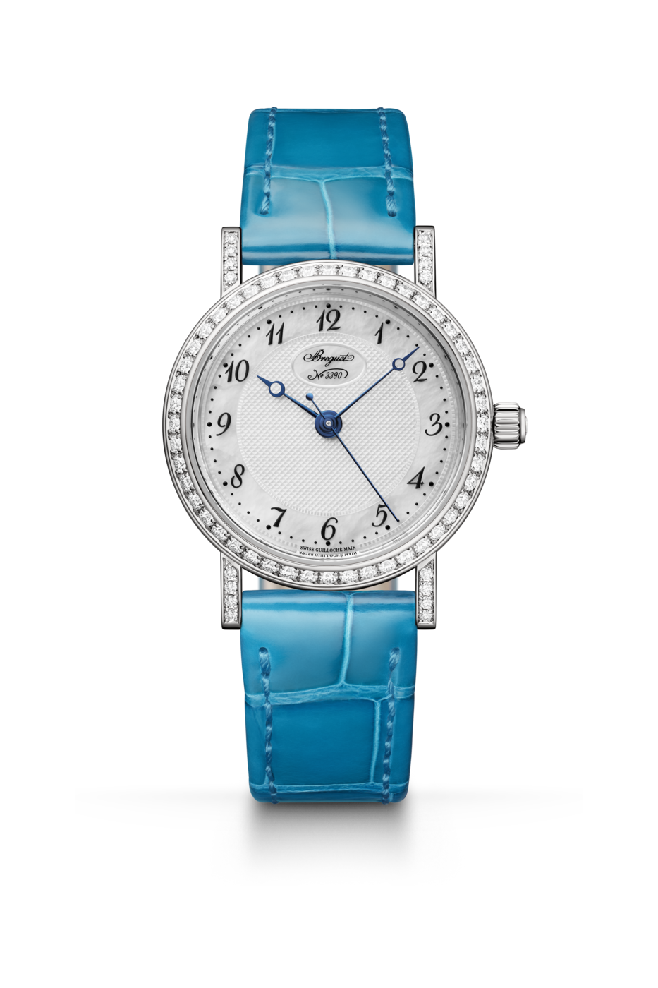 간편한 교체 시스템이 개발되어 도구를 사용하지 않고도 다른 스트랩으로 자유롭게 교체할 수 있습니다. 섬세한 디테일과 더불어 크라운에는 다이아몬드 카보숑이 세팅되었습니다. 케이스에는 64개의 브릴리언트 컷 다이아몬드가 세팅된 베젤과 러그가 자리잡고 있습니다. 머더 오브 펄 다이얼은 로즈 엔진 위 정교한 수공 인그레이빙이 장식되었으며 브레게 아라비아 숫자가 있는 아워 챕터로 완성됩니다.