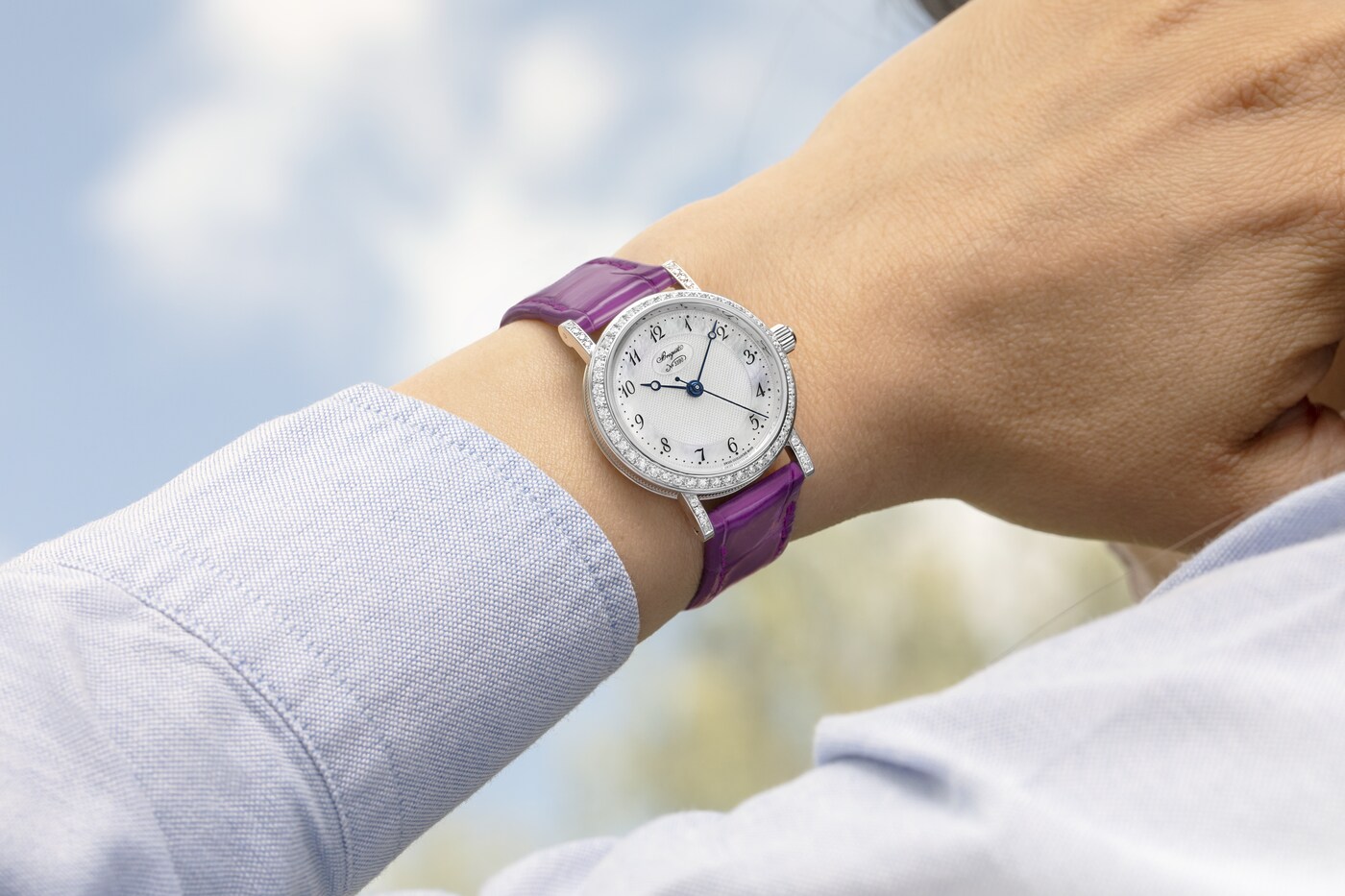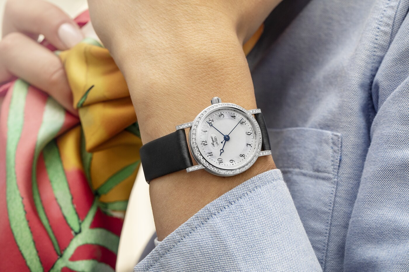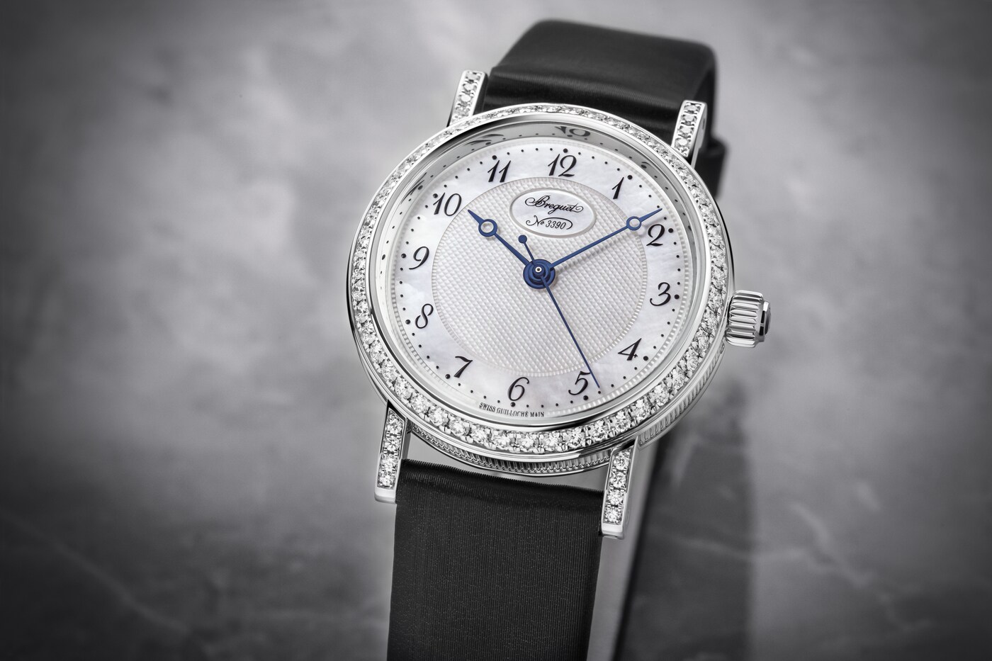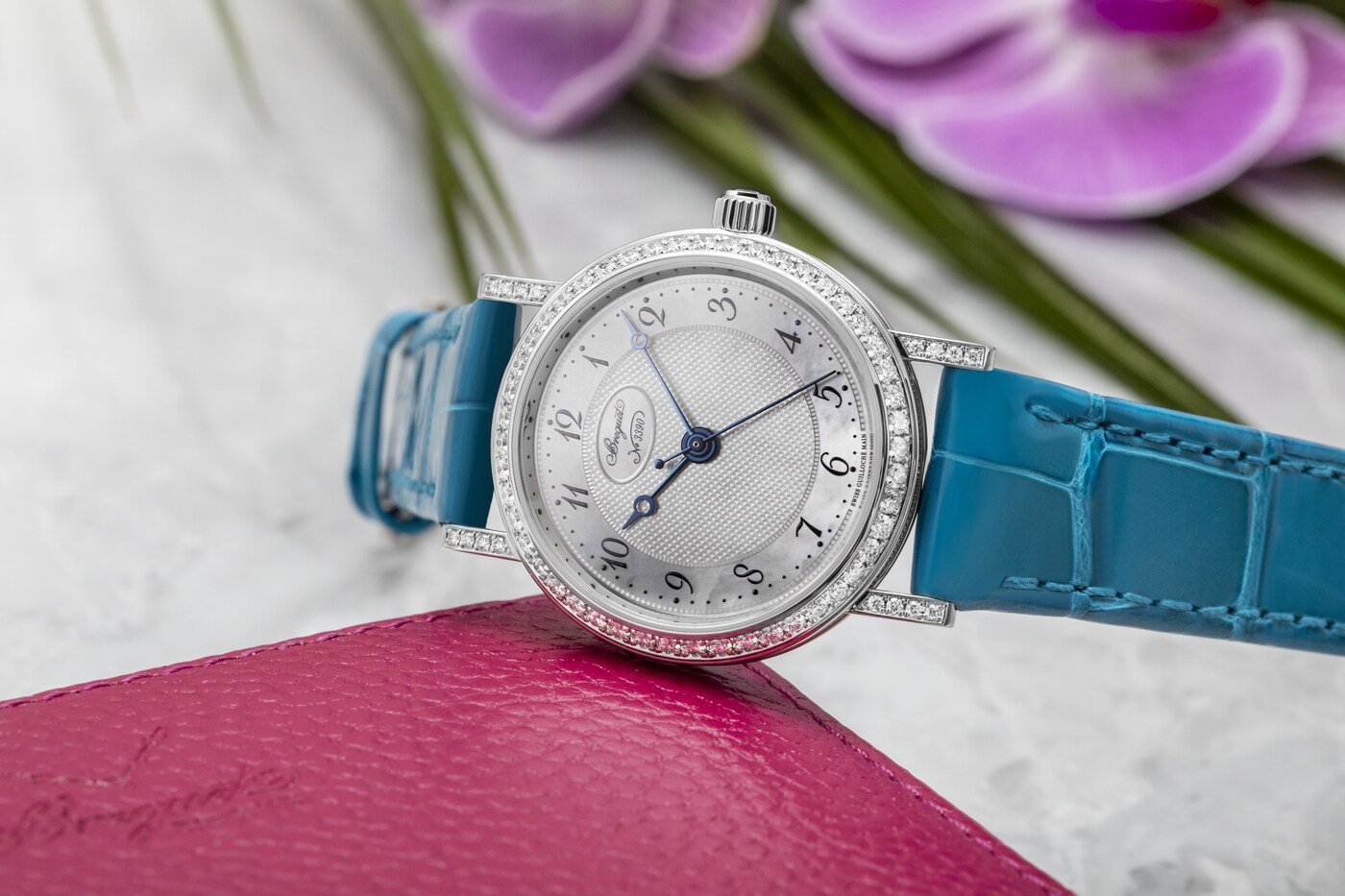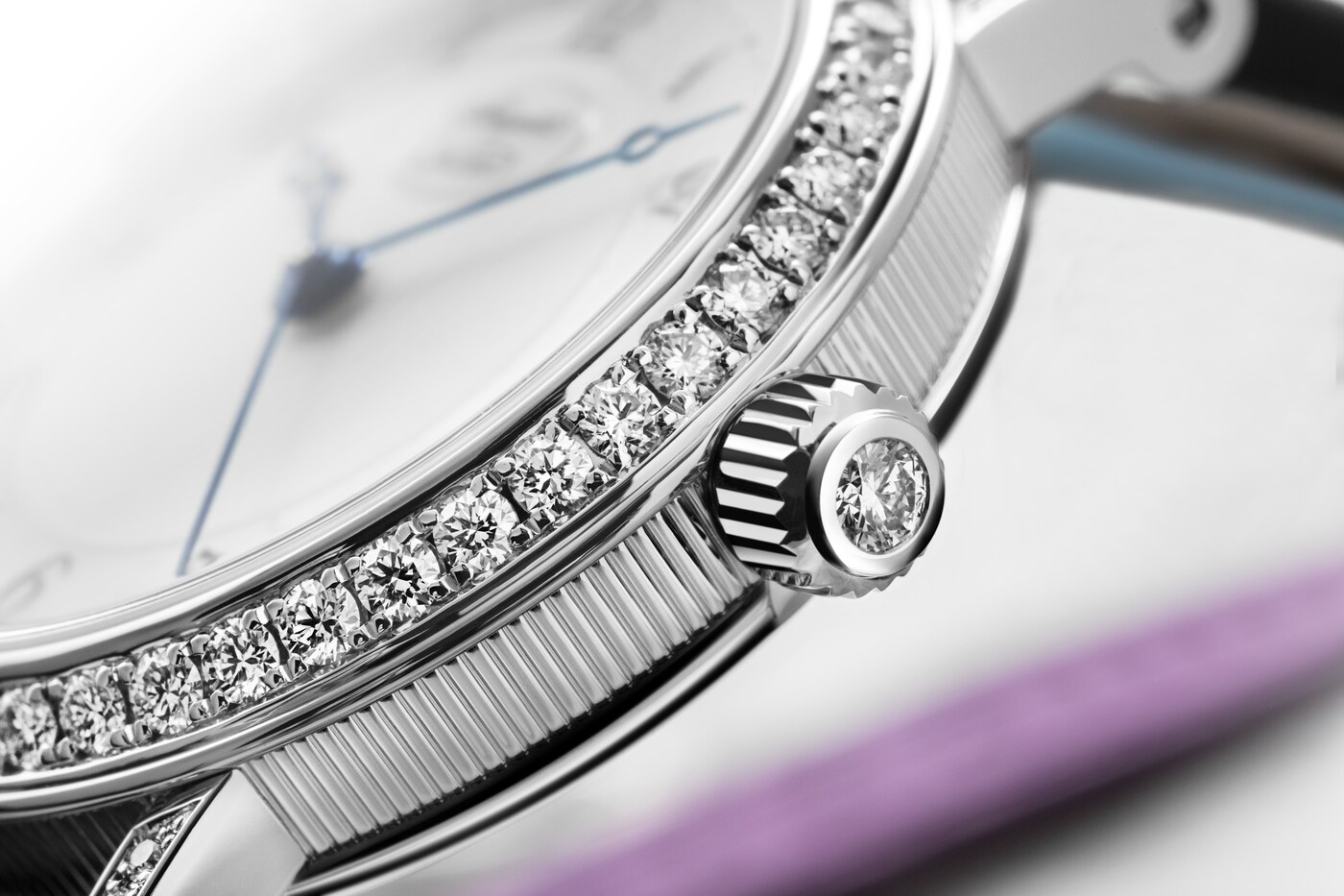 간편한 교체 시스템이 개발되어 도구를 사용하지 않고도 다른 스트랩으로 자유롭게 교체할 수 있습니다. 섬세한 디테일과 더불어 크라운에는 다이아몬드 카보숑이 세팅되었습니다. 케이스에는 64개의 브릴리언트 컷 다이아몬드가 세팅된 베젤과 러그가 자리잡고 있습니다. 머더 오브 펄 다이얼은 로즈 엔진 위 정교한 수공 인그레이빙이 장식되었으며 브레게 아라비아 숫자가 있는 아워 챕터로 완성됩니다.