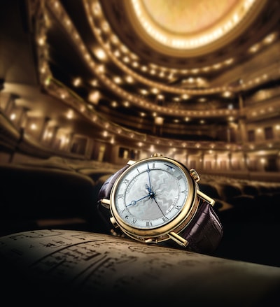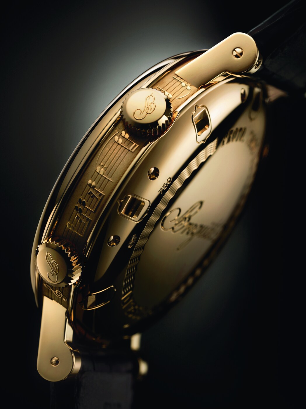 이러한 위업은 기존 실린더를 디스크로 대체하고 건반의 메탈 블레이드 15개를 교대로 작동할 수 있는 메커니즘으로 구현되었습니다. 두 번째 혁신 기술을 통해, 방수 기능을 해치지 않고도 멜로디를 전송하는 데 필요한 진동수를 증폭할 수 있습니다. 무브먼트 아래, 로즈 엔진 위 수공 인그레이빙한 메탈 글래스 소재의 멤브레인이 이에 해당합니다. 이 제품의 다이얼 중앙에는 시, 분, 초가 표시되며, 배터리 인디케이터와 멜로디 스타터는 각각 3시와 9시 30분에 위치합니다. 초침에는 높은음자리표 모티브로 끝나는 음악적 디테일을 감상할 수 있습니다. 다이아몬드 패턴의 로즈 엔진 위 수공 인그레이빙한 다이얼은 핀 베어링 디스크와 연결되어, 멜로디가 시작되면 완전히 한 바퀴 회전합니다.