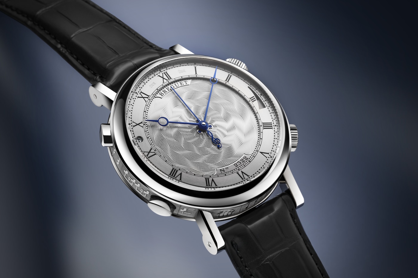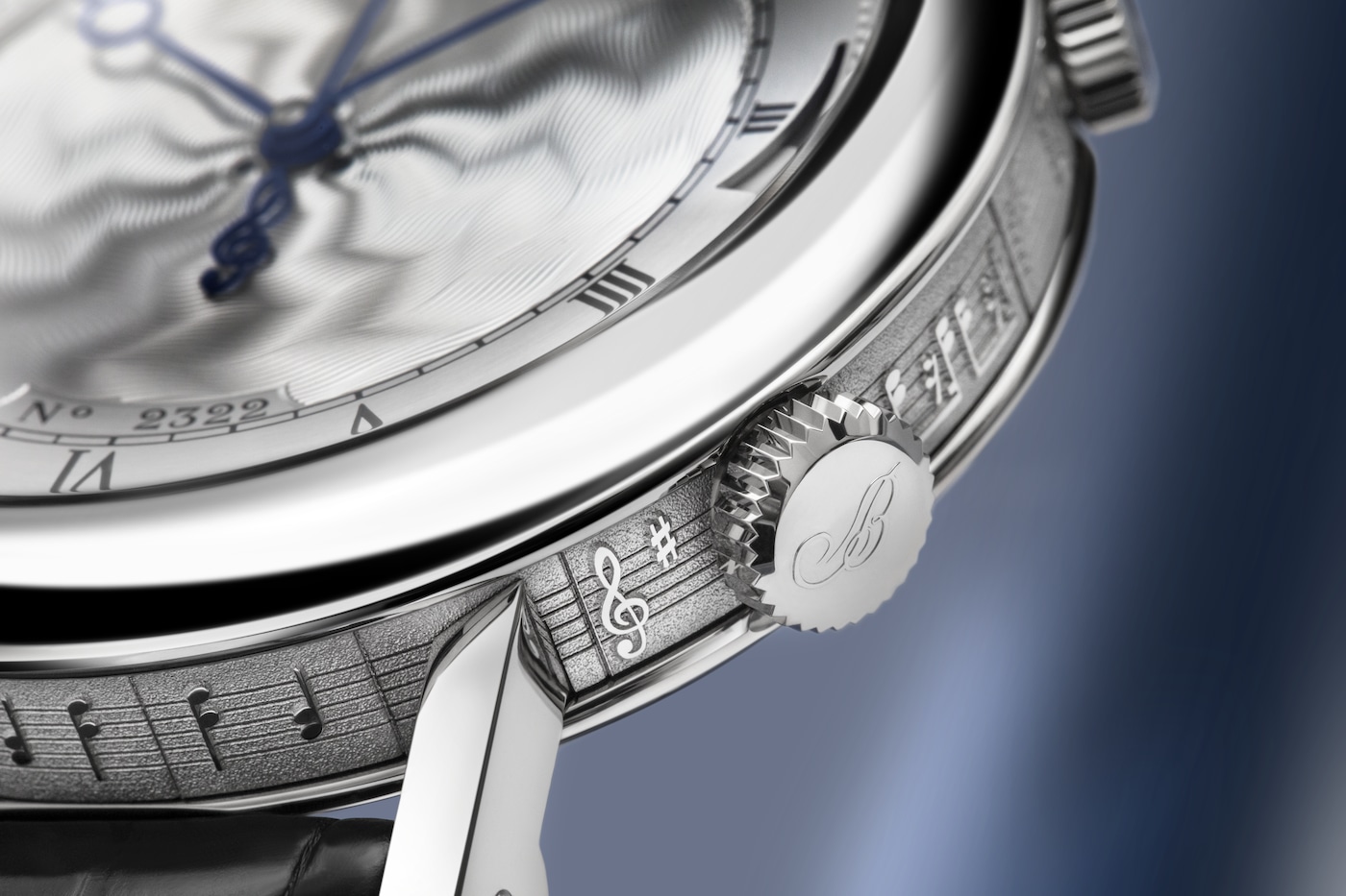 이러한 위업은 기존 실린더를 디스크로 대체하고 건반의 메탈 블레이드 15개를 교대로 작동할 수 있는 메커니즘으로 구현되었습니다. 두 번째 혁신 기술을 통해, 방수 기능을 해치지 않고도 멜로디를 전송하는 데 필요한 진동수를 증폭할 수 있습니다. 무브먼트 아래, 로즈 엔진 위 수공 인그레이빙한 메탈 글래스 소재의 멤브레인이 이에 해당합니다. 이 제품의 다이얼 중앙에는 시, 분, 초가 표시되며, 배터리 인디케이터와 멜로디 스타터는 각각 3시와 9시 30분에 위치합니다. 초침에는 높은음자리표 모티브로 끝나는 음악적 디테일을 감상할 수 있습니다. 다이아몬드 패턴의 로즈 엔진 위 수공 인그레이빙한 다이얼은 핀 베어링 디스크와 연결되어, 멜로디가 시작되면 완전히 한 바퀴 회전합니다.