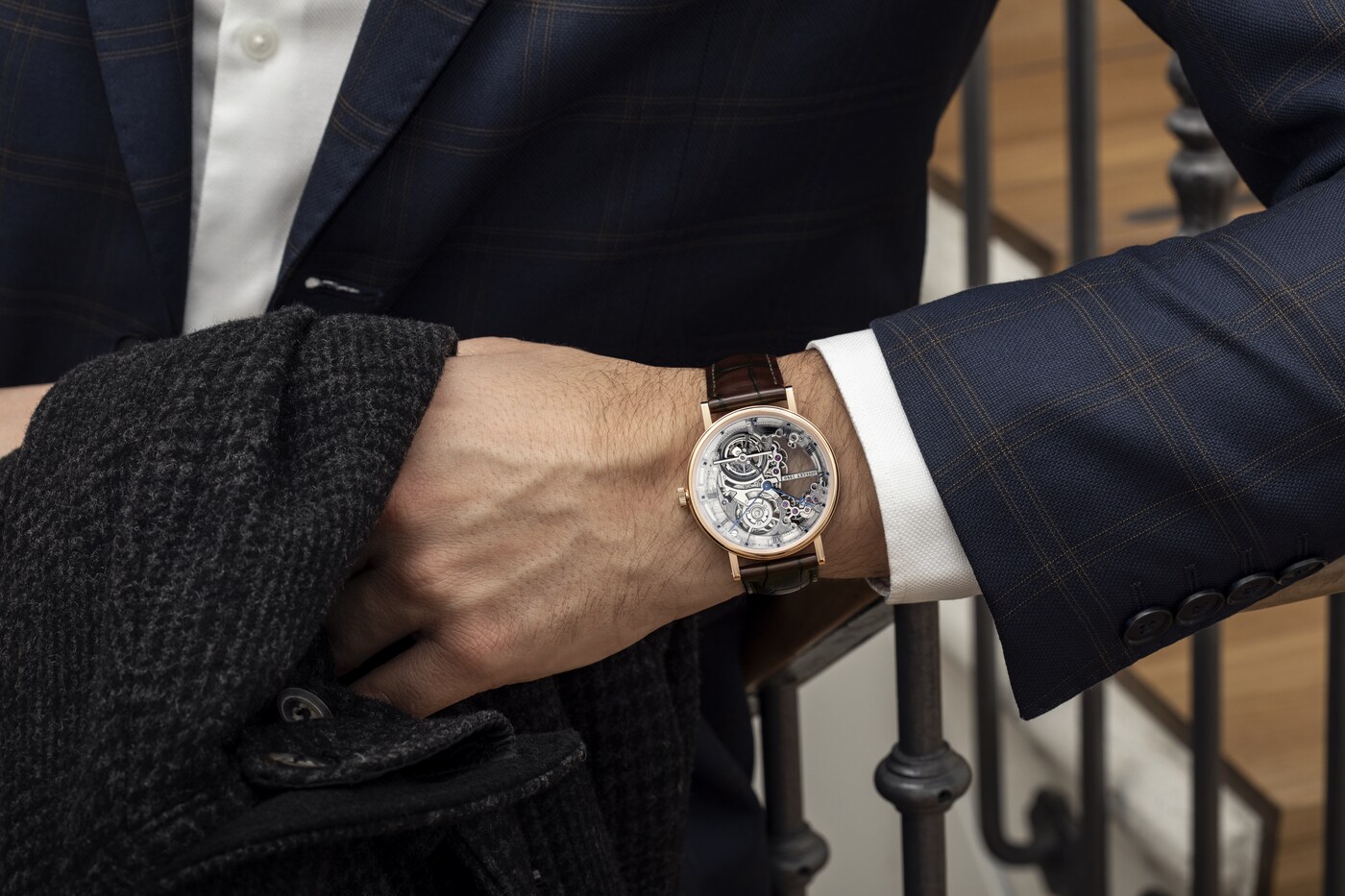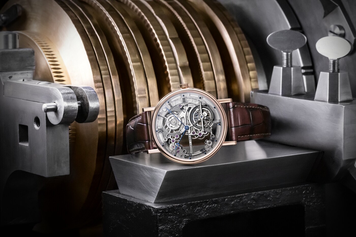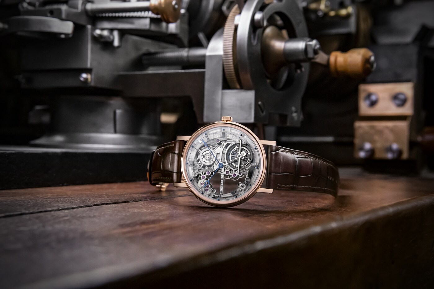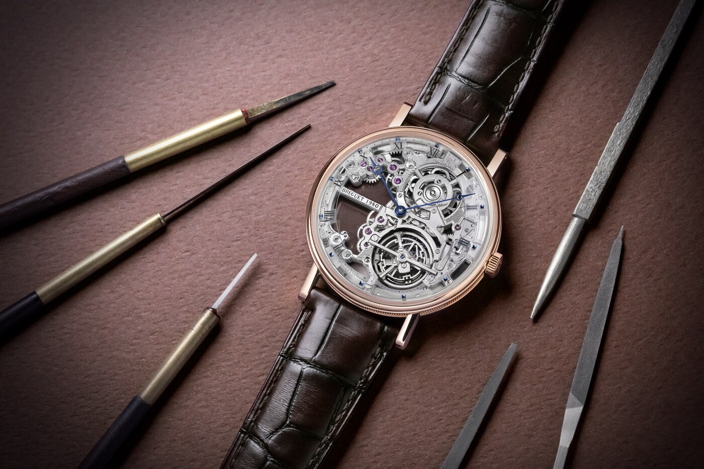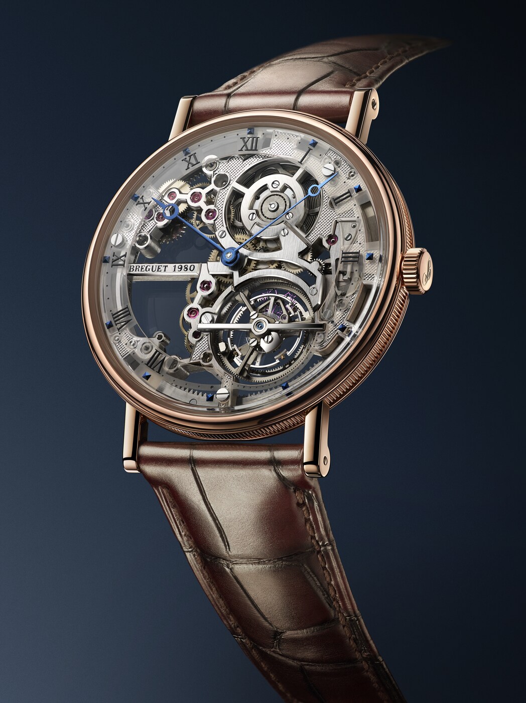 이 모델을 위해, 브레게는 3mm 두께의 엑스트라-플랫 셀프 와인딩 투르비용 무브먼트를 스켈레톤 메커니즘으로 구현하여 장인 기술 자부심을 더했습니다.