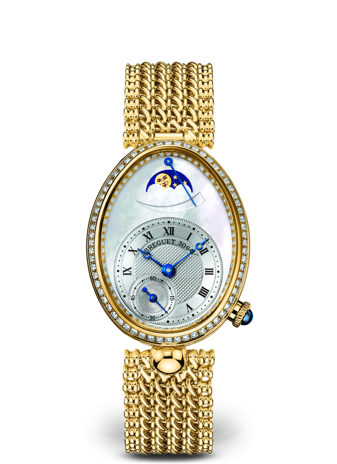 12시 방향에 위치한 인디케이터들과 6시 및 7시 방향의 오프센터 아워 챕터 및 스몰 세컨즈는 이 역사적인 시계에서 직접적인 영감을 받았습니다. 브레게 하우스는 다이얼을 더욱 빛내기 위해 블루 핸즈와 머더 오브 펄 및 기요셰 실버드 골드를 선택했습니다. 베젤과 다이얼 플랜지에는 다이아몬드가, 크라운에는 카보숑이 세팅되어 있습니다.