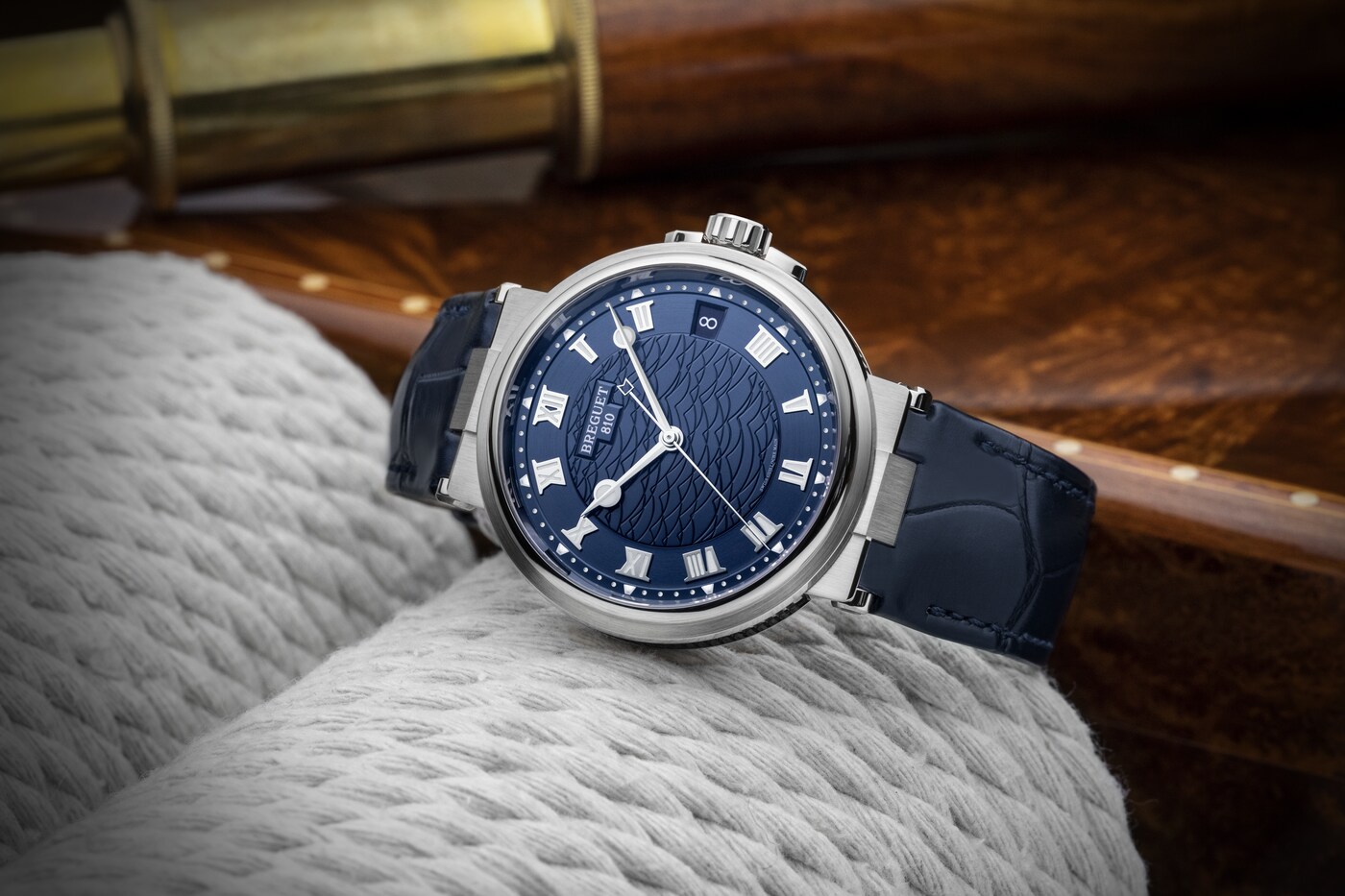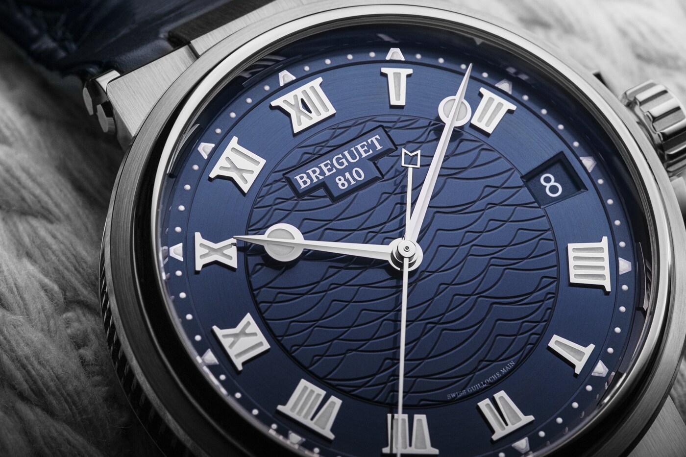 해군기 형태와 브레게 이니셜의 균형을 맞추는 초침 등 다양한 디테일이 마린 컬렉션의 정신을 떠올리게 합니다. 40mm 모델의 크라운은 파도 형태의 장식으로 둘러싸여 있습니다. 뒷면의 사파이어 크리스탈 케이스백에서는 셀프 와인딩 메커니즘이 드러나며 방향타를 연상시키는 로터를 감상할 수 있습니다.