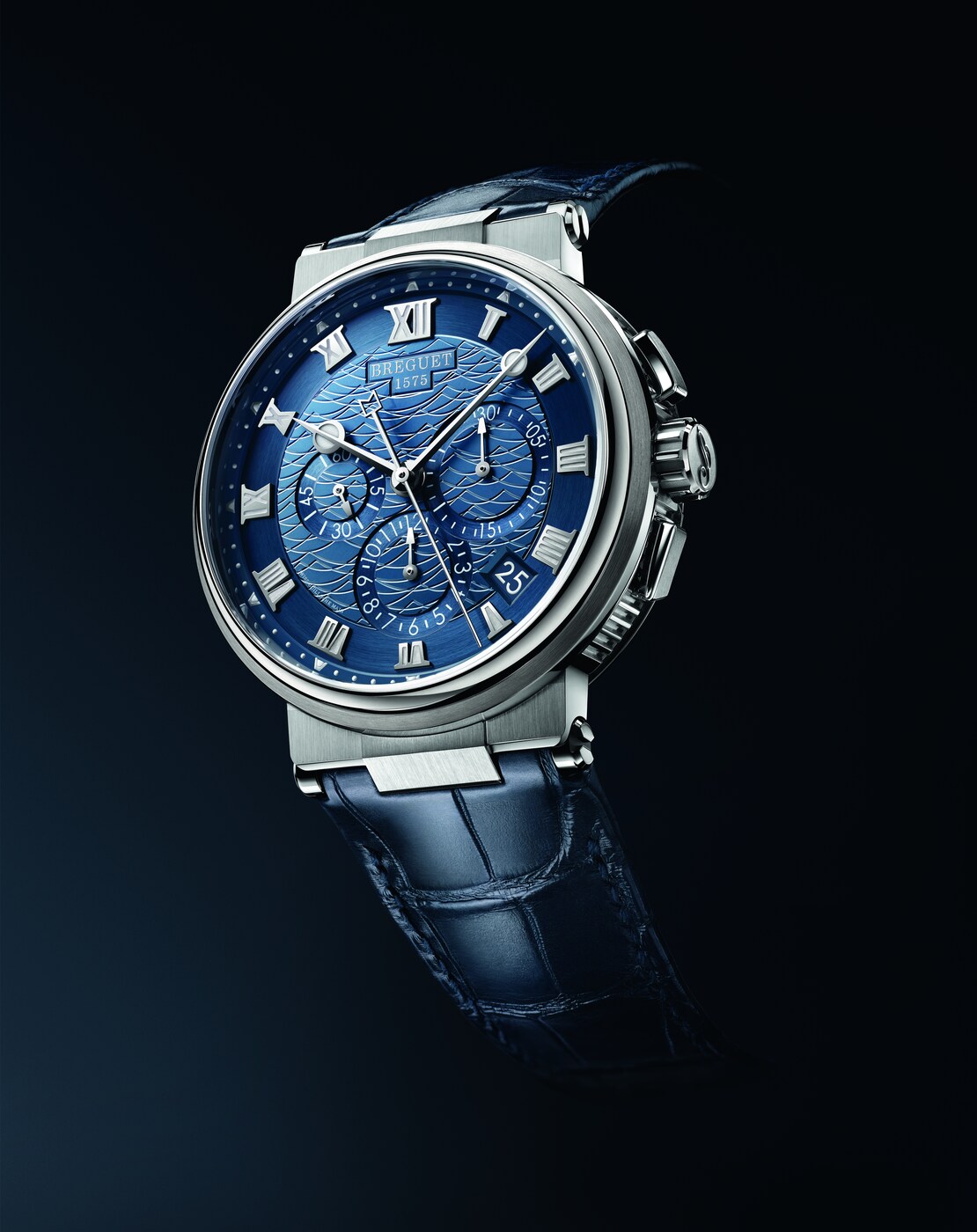 커다란 중앙 핸드로 표시되는 시계는 플라이백 크로노그래프 기능과 4시와 5시 사이에 캘린더 인디케이터를 갖추고 있습니다.