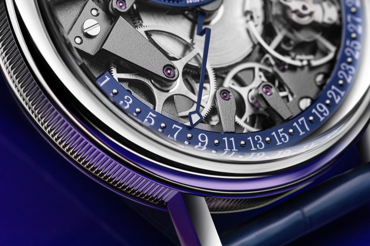 시간 표시는 12시 방향의 오프 센터 다이얼을 마주한 레트로그레이드 캘린더로 완성됩니다.