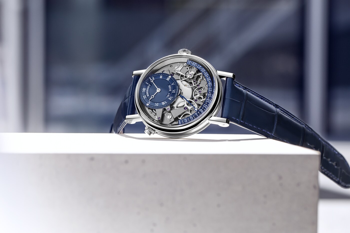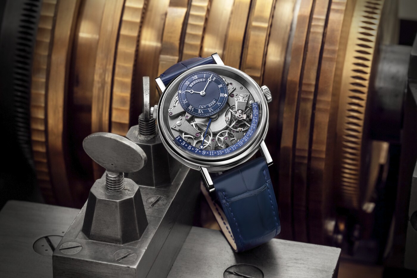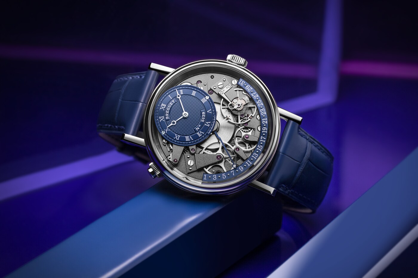 오프 센터 다이얼을 장식하여 시와 분을 표시하는 전통적인 브레게 핸즈와 함께, 놀라운 구조를 자랑하는 또 다른 핸드가 있습니다. 수직 평면상에서 곡선을 이루는 이 핸드는 여러 레이어를 갖추어 3시에서 9시 사이에 위치한 섹터에 도달할 때까지 무브먼트 부품 위로 매끄럽게 지나갈 수 있습니다. 레트로그레이드 기능을 사용하면 말일에서 1일로 되돌아갈 수 있습니다. 유명한 작품 중 일부에 장착할 레트로그레이드 날짜를 최초로 개발한 사람은 바로 아브라함 루이 브레게였습니다.