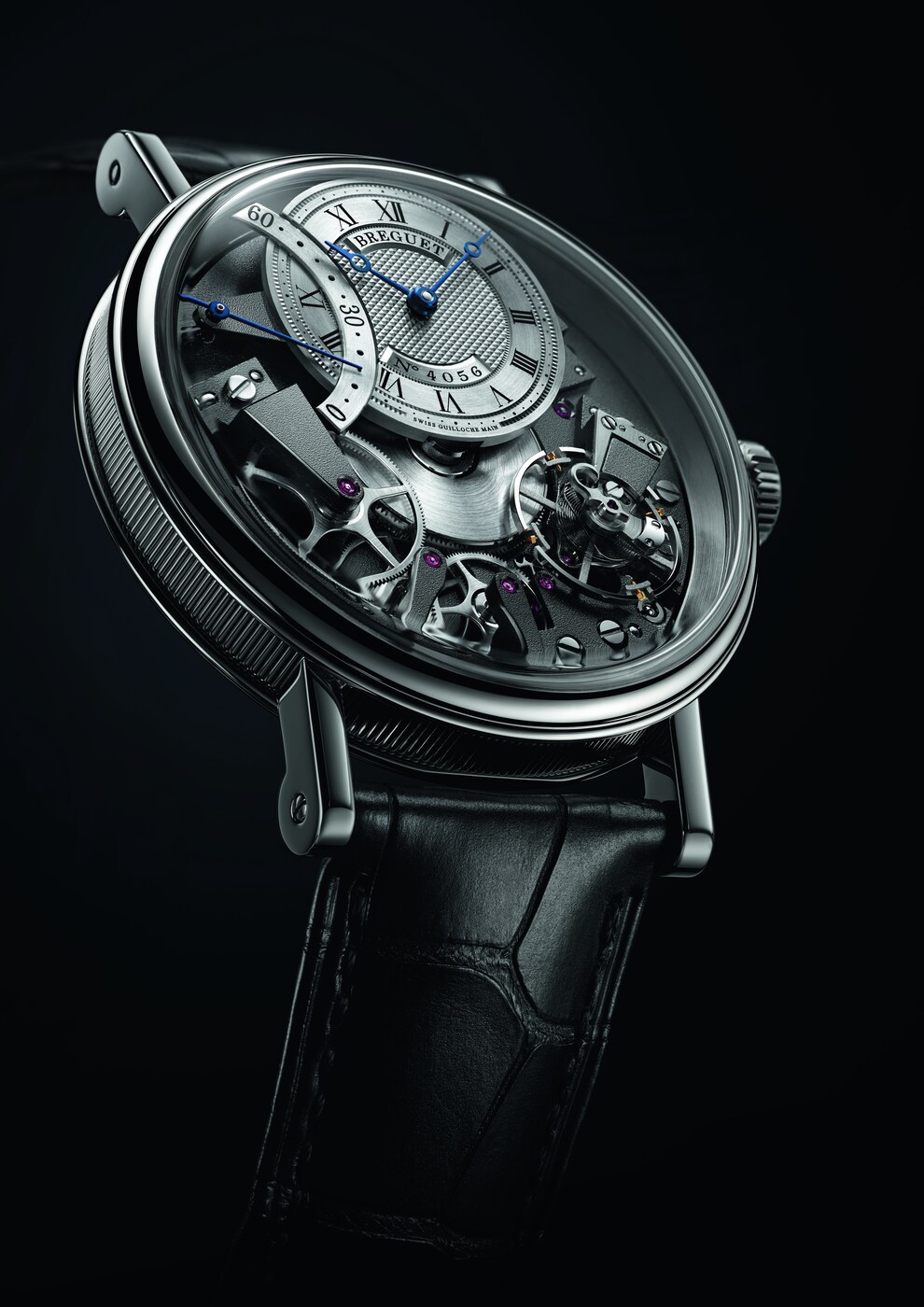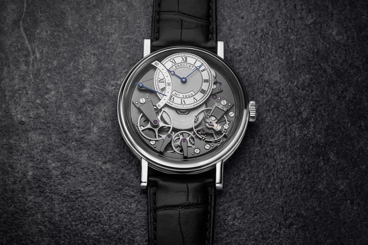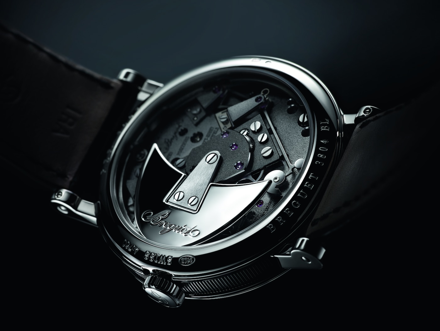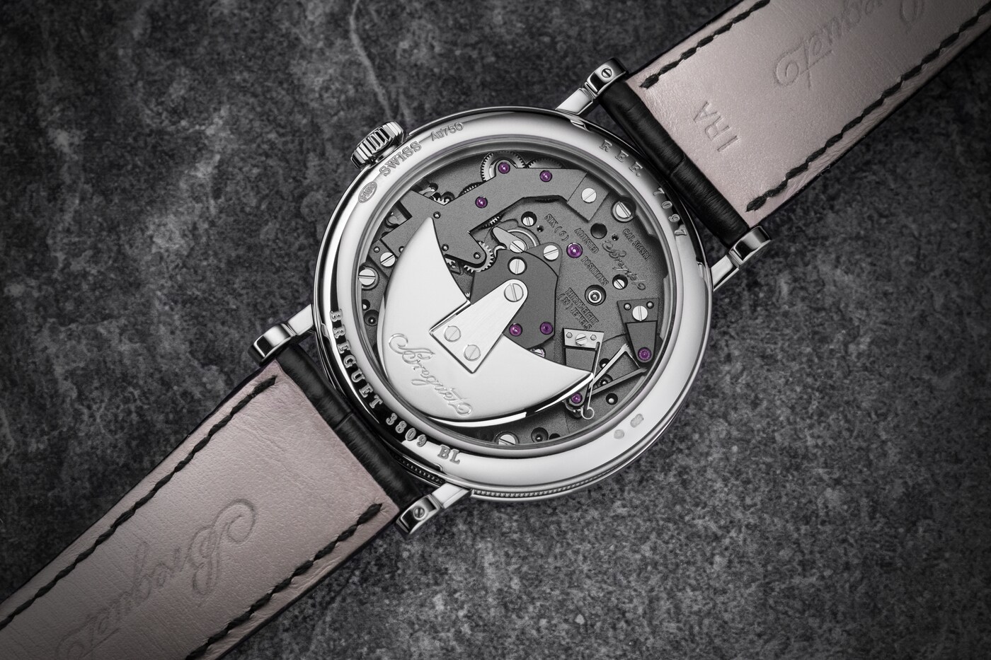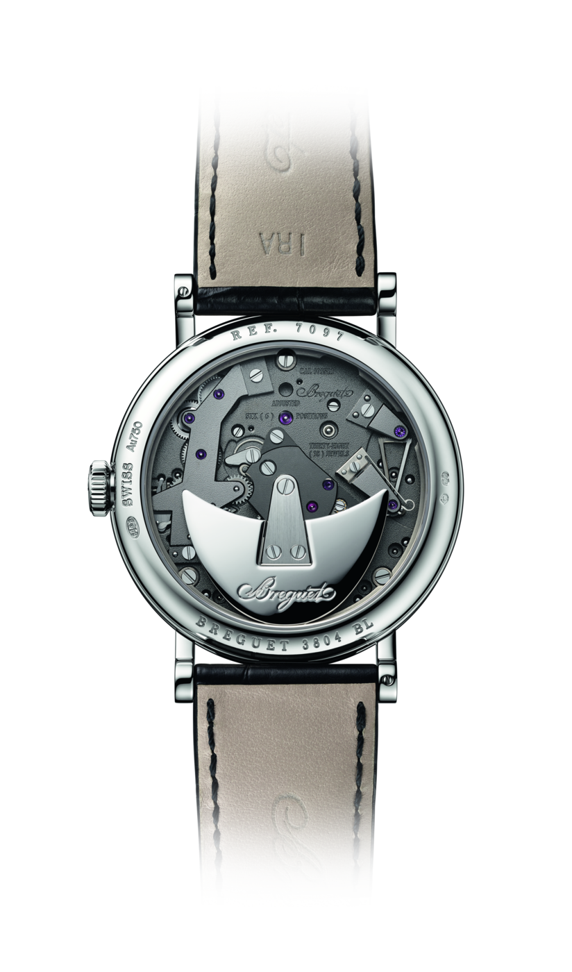 전체적으로 대칭을 이루고 있는 이 시계는 의심의 여지 없이 트래디션 컬렉션에 속합니다. 일반적으로 다이얼 아래에 숨겨져 있는 브릿지, 휠, 이스케이프먼트, 배럴 및 기타 무브먼트 구성 요소는 메인 플레이트를 통해 만나볼 수 있습니다. 이 모델의 또 다른 특징은 브레게가 발명한 4시 방향의 파라슈트로 밸런스 휠 축을 충격으로부터 보호하는 데 사용됩니다. 이는 현대의 “잉카블록(Incabloc)”과 같이 충격을 방지하는 모든 보호 장치의 원형입니다.