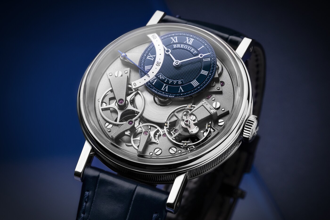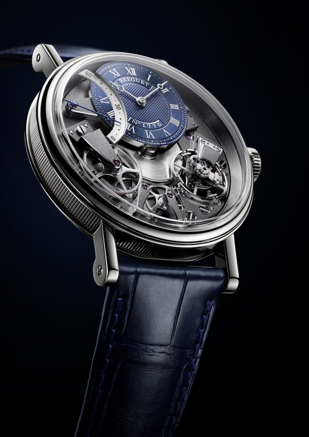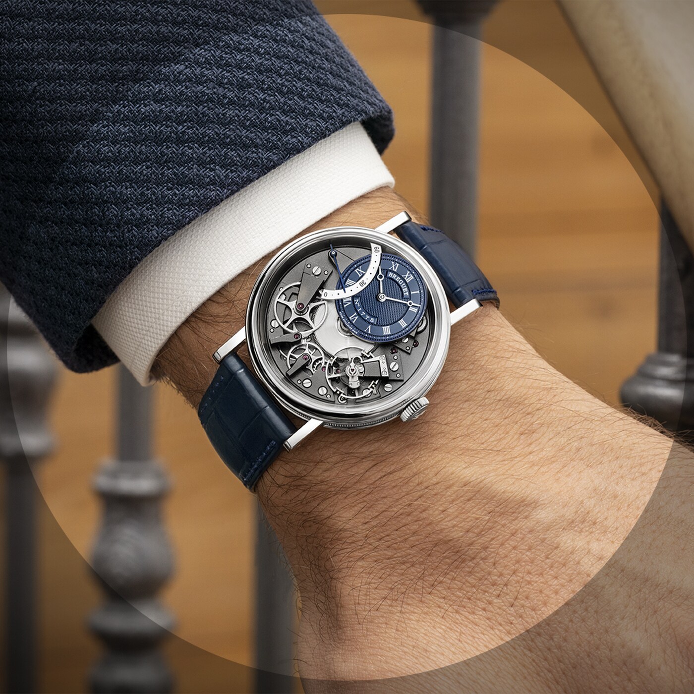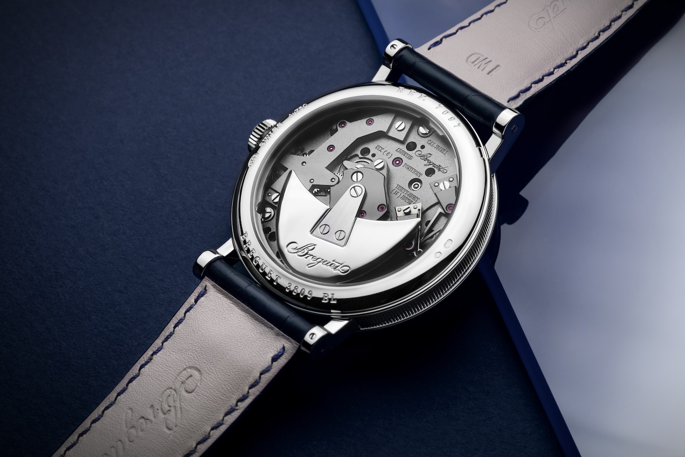전체적으로 대칭을 이루고 있는 이 시계는 의심의 여지 없이 트래디션 컬렉션에 속합니다. 일반적으로 다이얼 아래에 숨겨져 있는 브릿지, 휠, 이스케이프먼트, 배럴 및 기타 무브먼트 구성 요소는 메인 플레이트를 통해 만나볼 수 있습니다. 이 모델의 또 다른 특징은 브레게가 발명한 4시 방향의 파라슈트로 밸런스 휠 축을 충격으로부터 보호하는 데 사용됩니다. 이는 현대의 “잉카블록(Incabloc)”과 같이 충격을 방지하는 모든 보호 장치의 원형입니다.