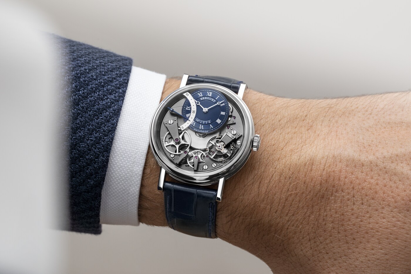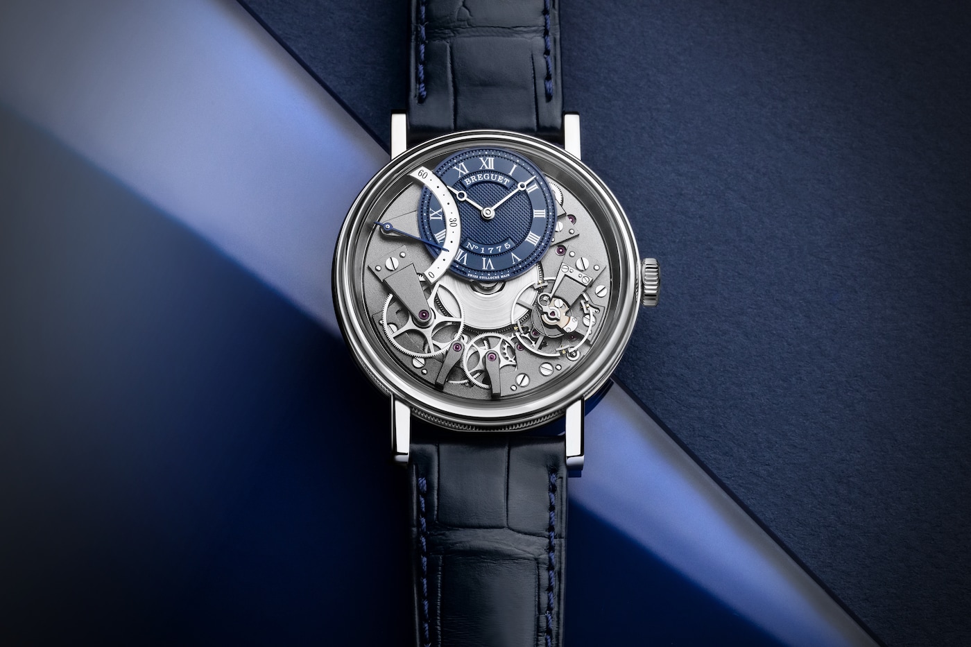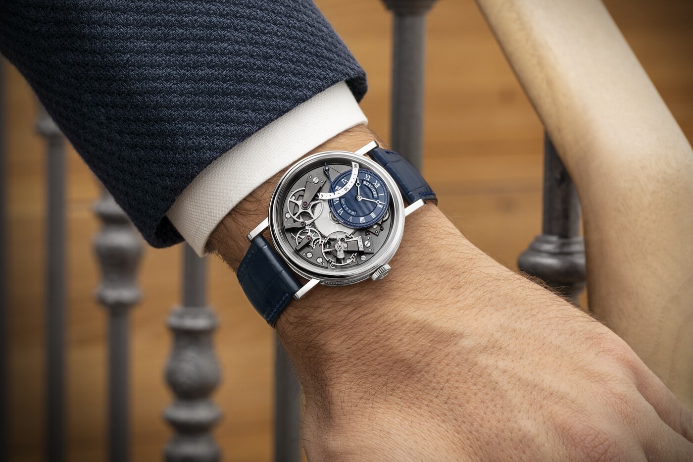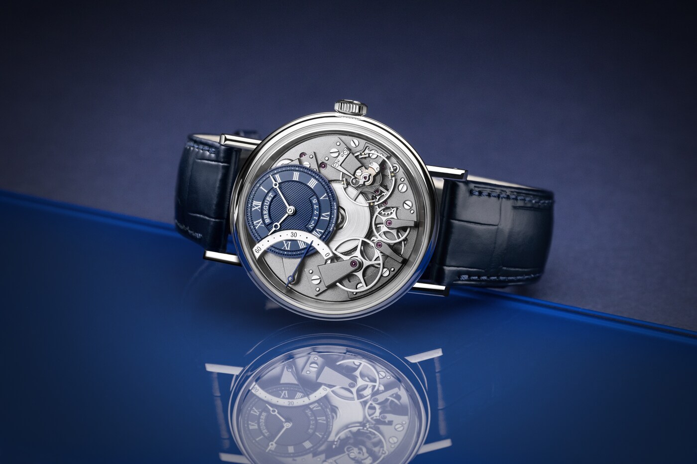 전체적으로 대칭을 이루고 있는 이 시계는 의심의 여지 없이 트래디션 컬렉션에 속합니다. 일반적으로 다이얼 아래에 숨겨져 있는 브릿지, 휠, 이스케이프먼트, 배럴 및 기타 무브먼트 구성 요소는 메인 플레이트를 통해 만나볼 수 있습니다. 이 모델의 또 다른 특징은 브레게가 발명한 4시 방향의 파라슈트로 밸런스 휠 축을 충격으로부터 보호하는 데 사용됩니다. 이는 현대의 “잉카블록(Incabloc)”과 같이 충격을 방지하는 모든 보호 장치의 원형입니다.