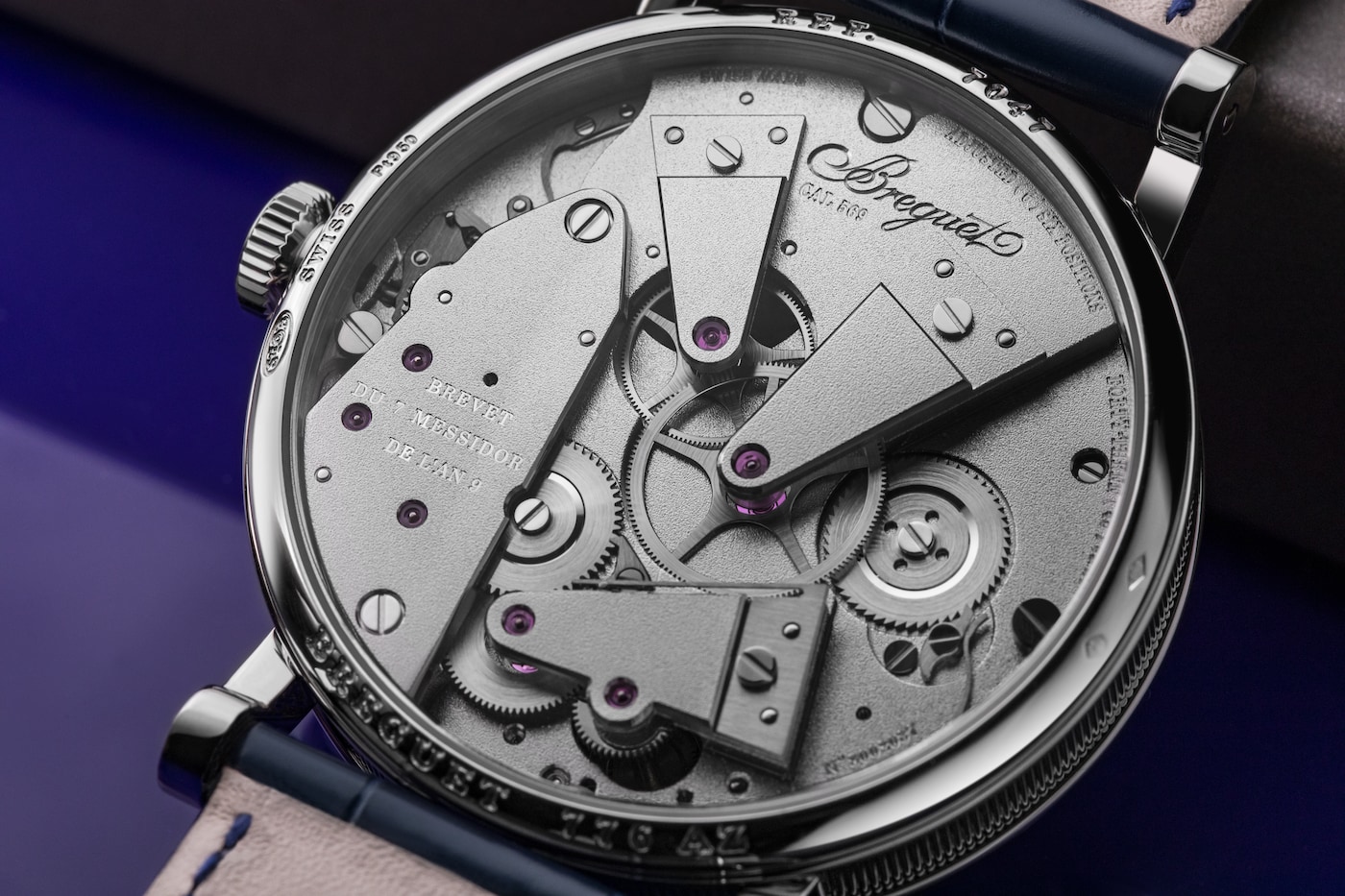 투르비용은 현존하는 상징적인 컴플리케이션 중 하나로, 아브라함 루이 브레게에 의해 발명되었다는 점에서 브레게 하우스와 긴밀하게 연결되어 있습니다. 트래디션 7047에 장착된 퓨제 체인 투르비용의 트랜스미션 메커니즘은 와인딩 수준에 관계없이 일정한 토크를 보장하여, 시계의 규칙적인 작동을 최적화하는 특성을 지닙니다. 또한 이 핸드 와인딩 시계는 파워 리저브에 관하여 특허를 적용받습니다. 10시 방향에 표시되는 파워 리저브는 감속 차동 시스템을 갖추어 배럴 드럼에 직접 디스플레이됩니다.