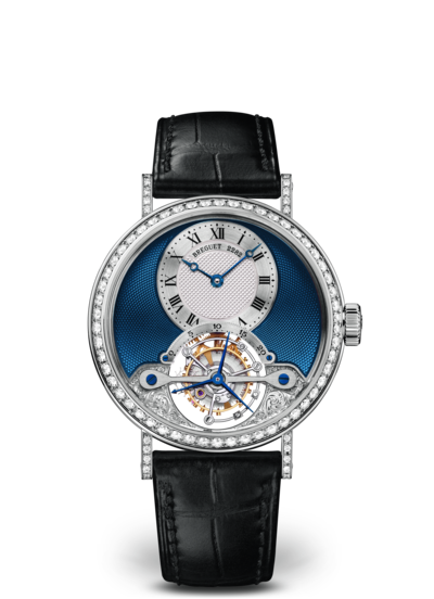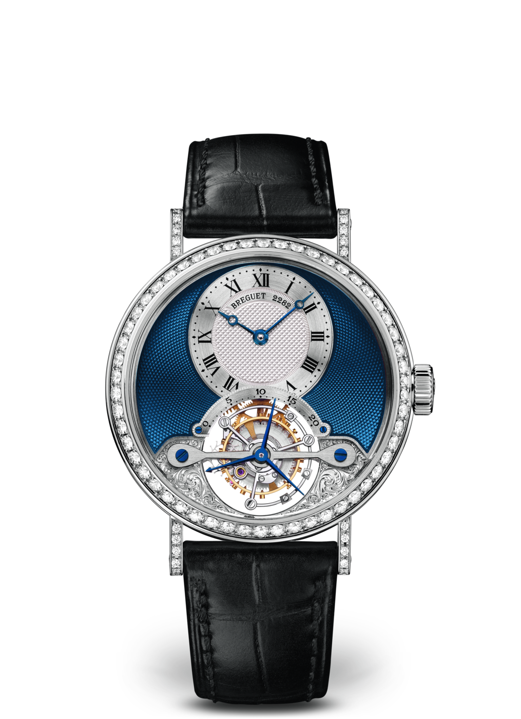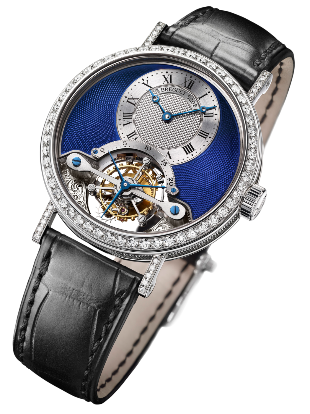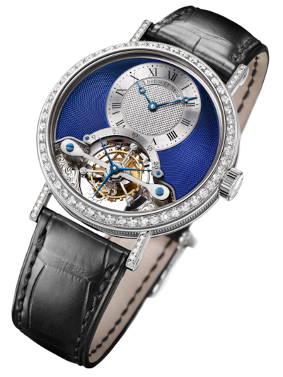 陀飞轮设于大型椭圆弧形视窗内,四周点缀珍珠母贝与璀璨钻石。玫瑰金表款通过白色珍珠母贝小时刻度圈显示时间,中央部分装饰雪花镶嵌钻石。在白色金表款上,繁星散落于珍珠母贝表盘,其上覆以午夜蓝色清漆,宛如迷人星空。陀飞轮前桥点缀雪花镶嵌钻石,仿佛划过夜空的流星。