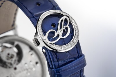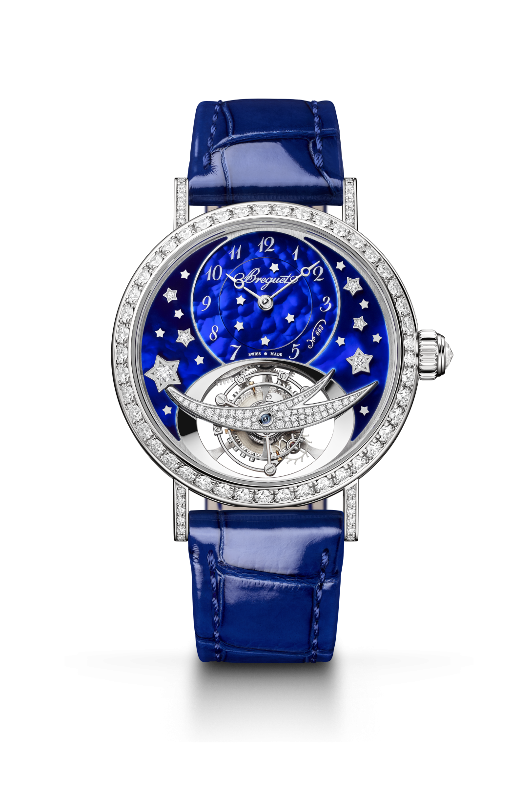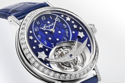 陀飞轮设于大型椭圆弧形视窗内,四周点缀珍珠母贝与璀璨钻石。玫瑰金表款通过白色珍珠母贝小时刻度圈显示时间,中央部分装饰雪花镶嵌钻石。在白色金表款上,繁星散落于珍珠母贝表盘,其上覆以午夜蓝色清漆,宛如迷人星空。陀飞轮前桥点缀雪花镶嵌钻石,仿佛划过夜空的流星。