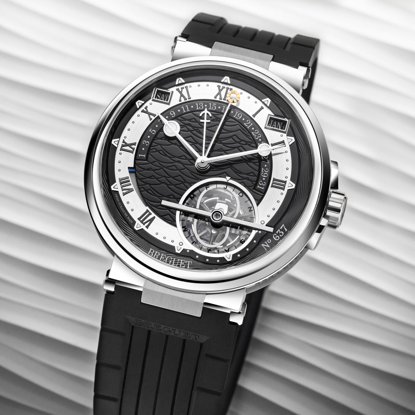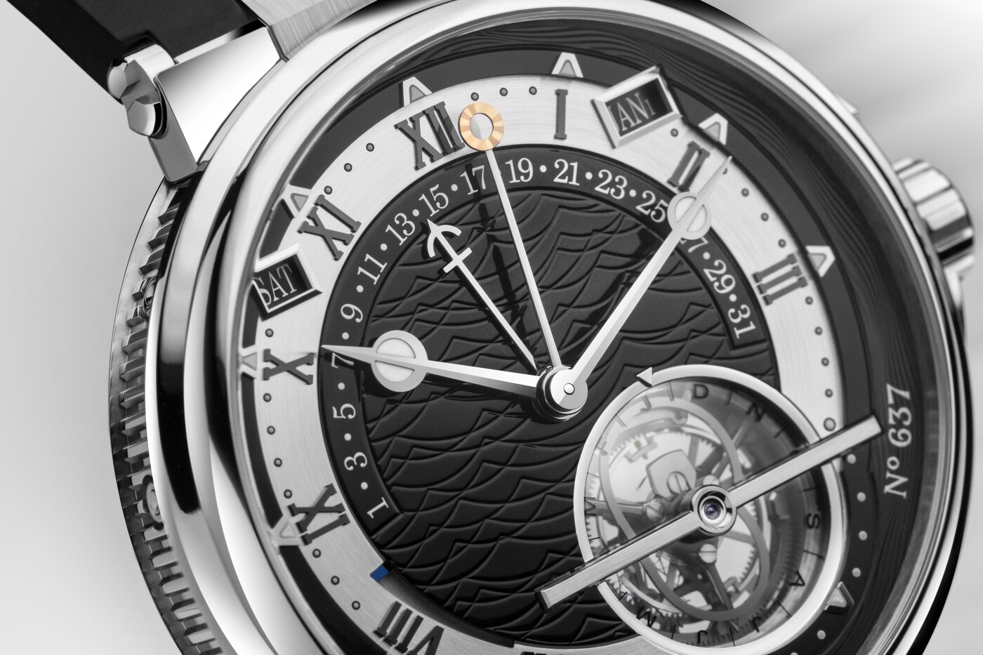 时间等式是一项令人着迷的高复杂功能,能够显示平均太阳时(日常使用时间)与真太阳时(根据地球围绕太阳自转而计量的时间)之间的时间差。宝玑将这一复杂功能与万年历及陀飞轮精妙相融,呈现于全新Marine航海系列铂金腕表的黑色表盘上。铂金是一种稀有且高度耐腐的珍贵金属,以其出色的物理性能与隽永光泽备受青睐。
