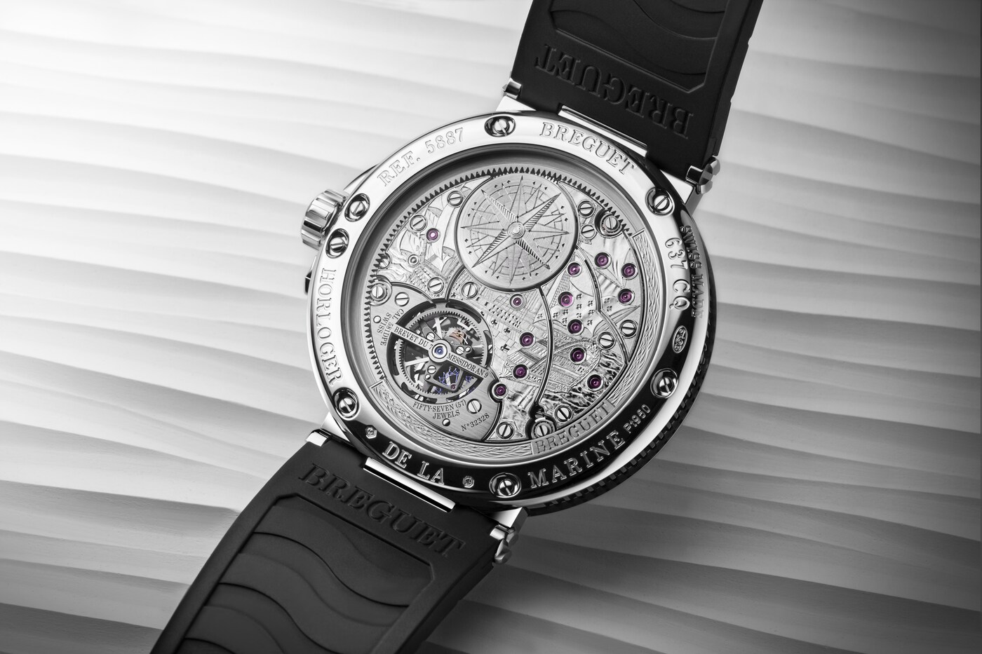 环形摆陀同样以铂金材质打造,其上装饰了以手工镌刻的“波浪纹”玑镂刻花图案,环绕于宝玑581 DPE型自动上链机芯周围。该机芯夹板以细致精湛的手工雕刻工艺描绘出于1752年投入使用的法国皇家海军战舰“路易斯皇家号”(Royal Louis)雄伟英姿。发条盒上亦饰有手工雕刻的罗盘玫瑰图案。