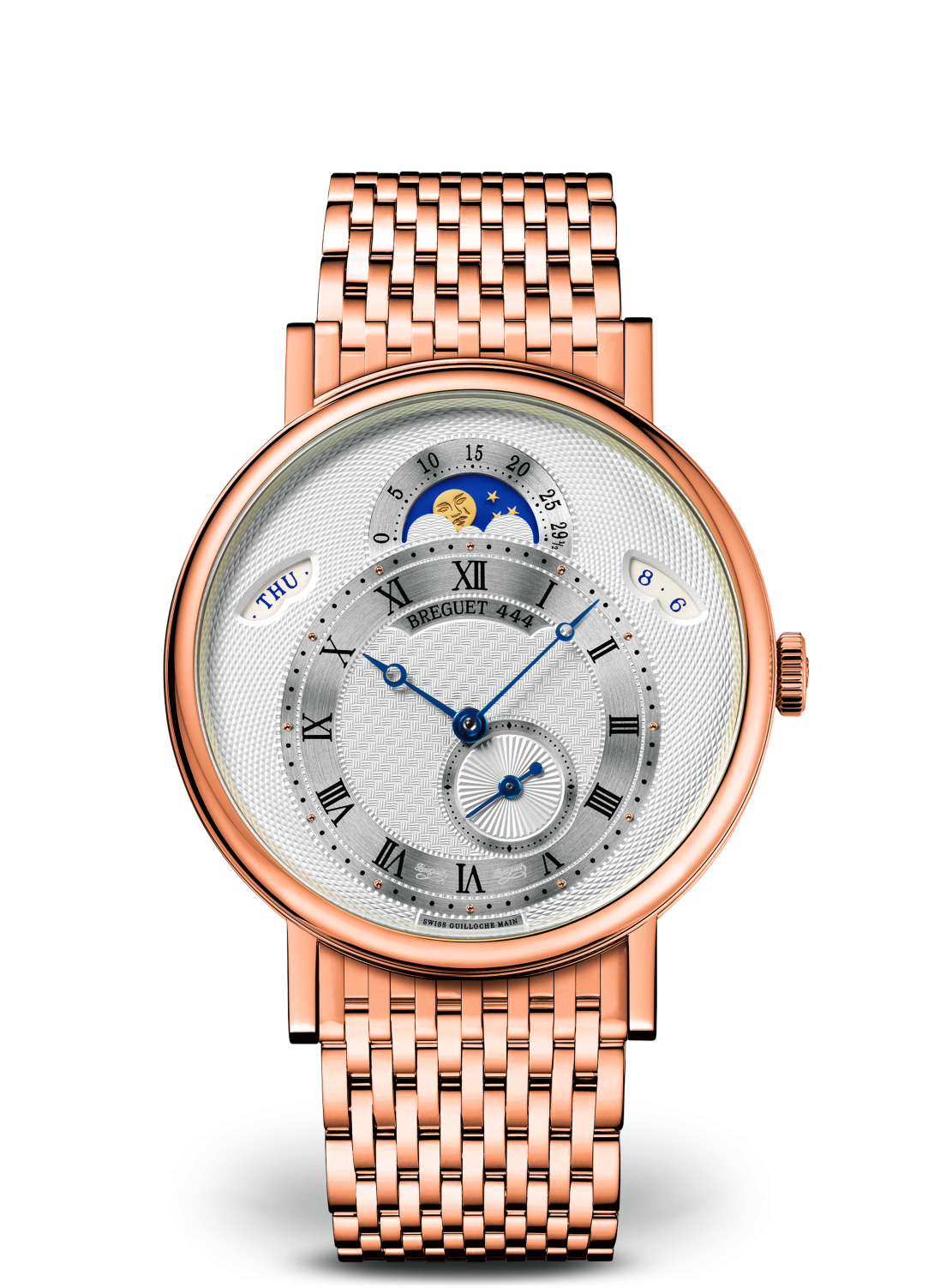偏心刻度圈位于表盘底部,并搭配经典的宝玑指针。在其上方设有月相显示,金质月亮以手工锤制而成,在漆面夜空中闪耀光芒。10点和2点位置各设一个窗口,分别显示星期和日期。这款时计搭载超薄机芯,其金质摆陀经由工艺大师以手工玑镂刻花打造。