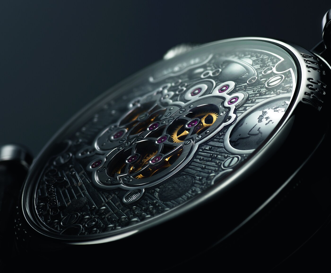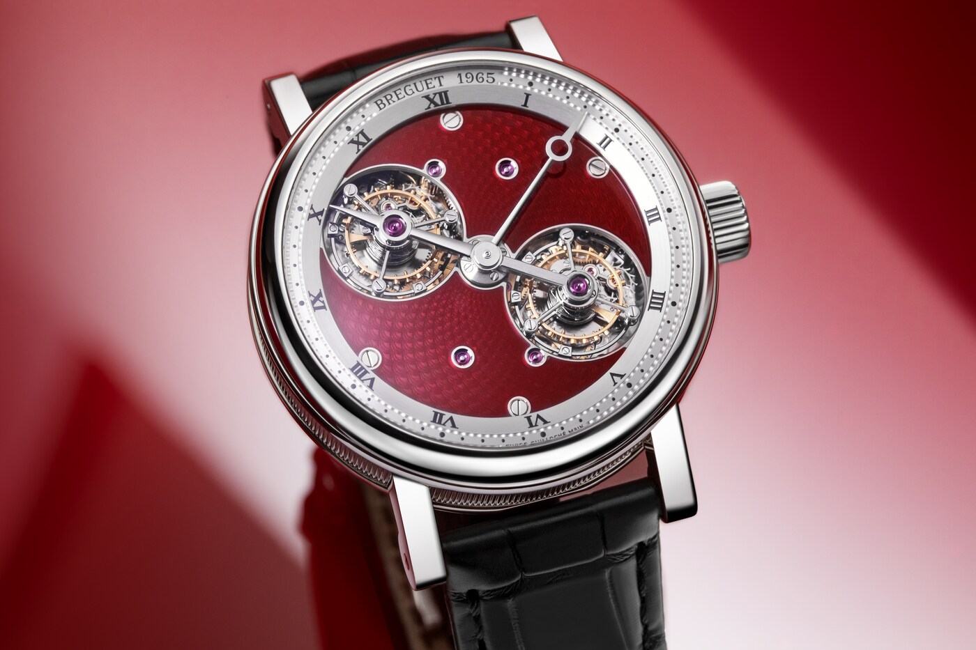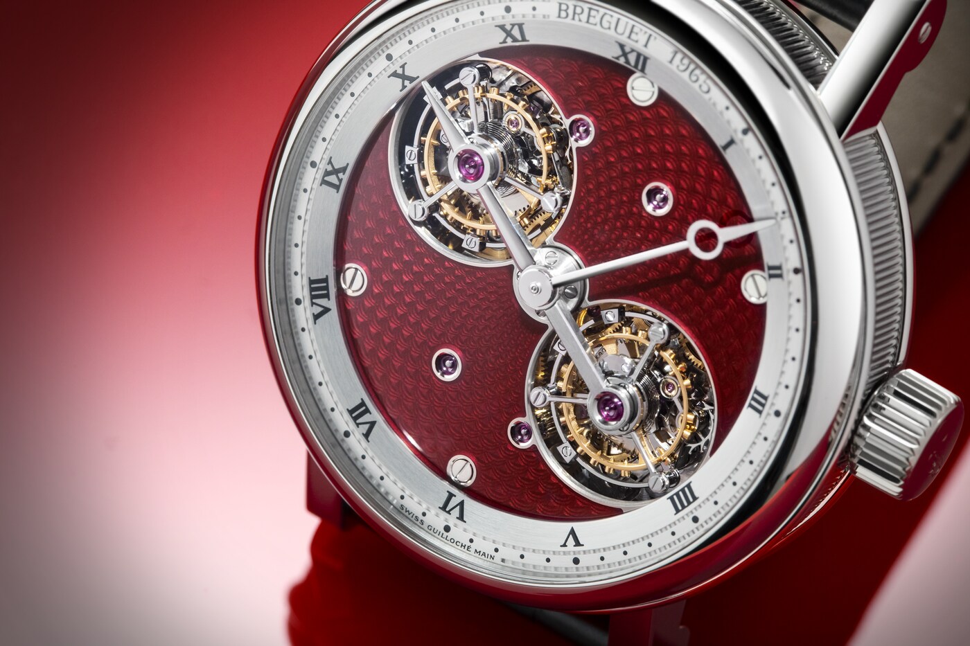 这款腕表的两枚陀飞轮显露无遗,以完全独立运作的方式围绕小时轴旋转。