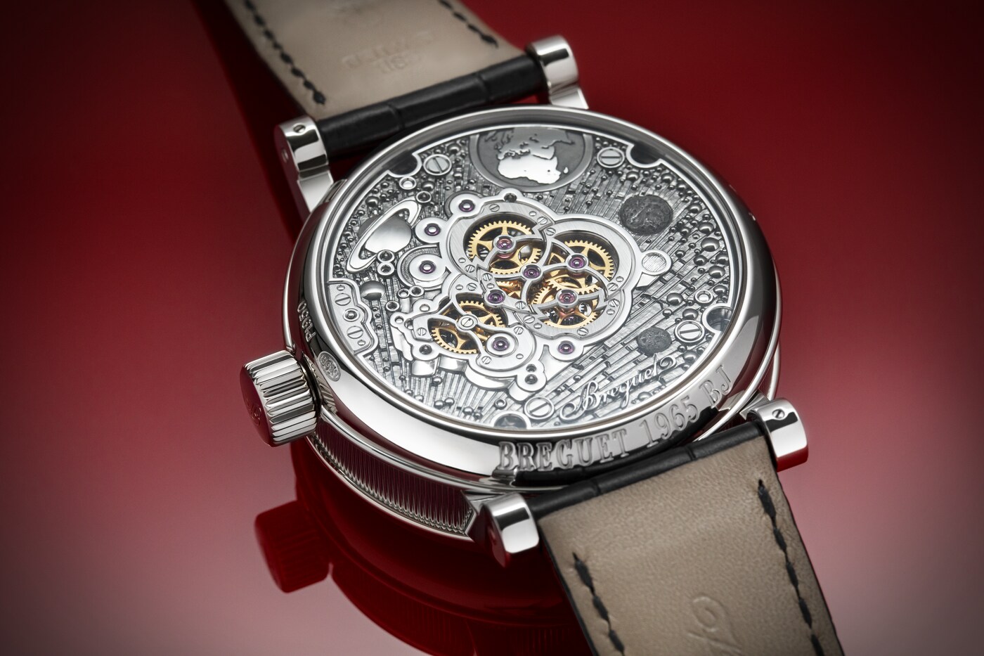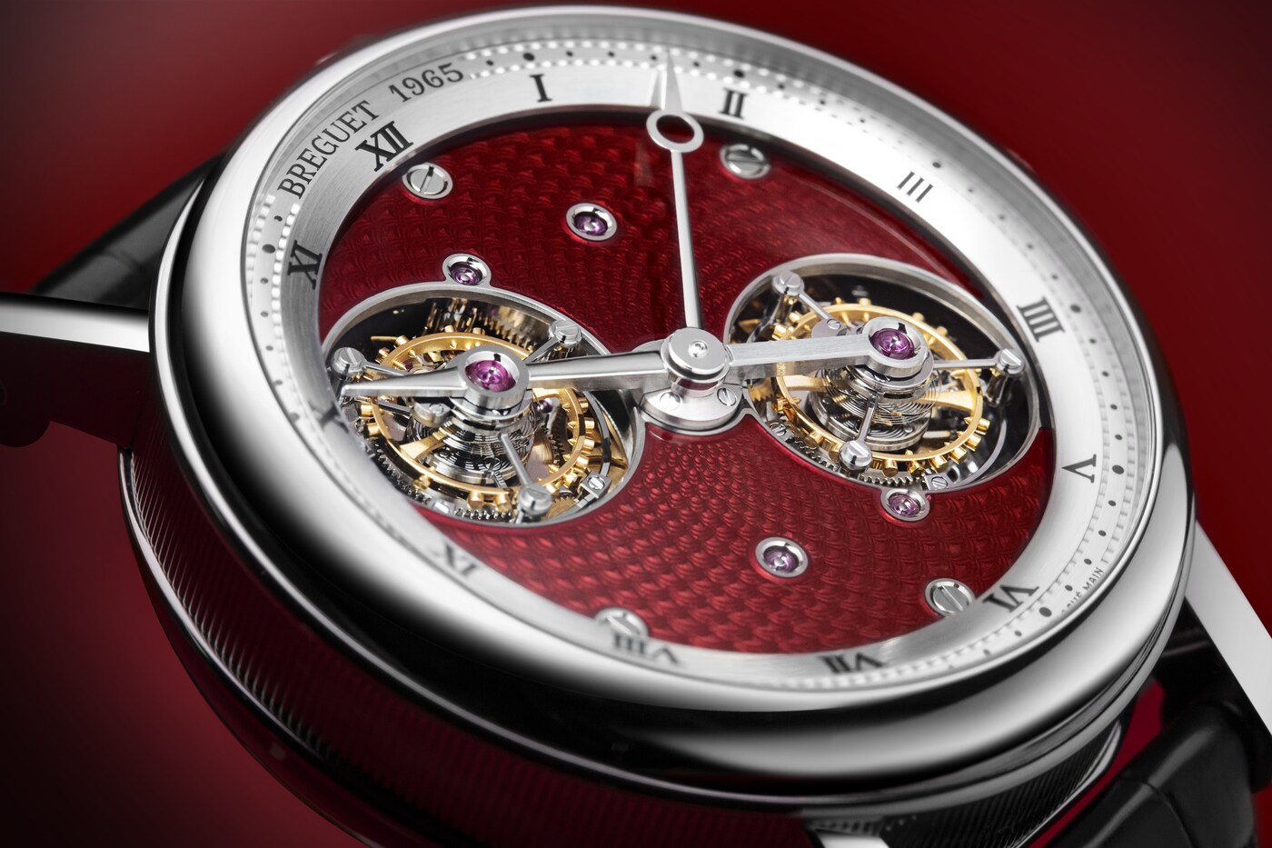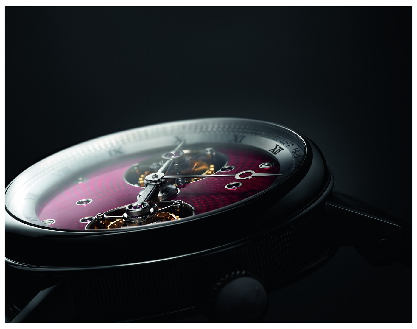 机芯装置每12小时自转一圈;与此同时,每枚陀飞轮每1分钟旋转一圈。相互连接的调速机构实现了双重旋转。连接两枚陀飞轮的前桥代替指针显示小时;表盘中央经典宝玑指针指示分钟。