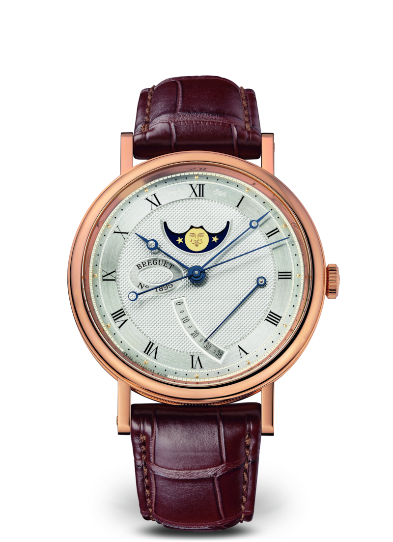 除中央时、分、秒显示功能外,这款时计亦配备两大复杂功能:位于12点位置的月相显示和3点位置的动力储存显示,动力储存以一根细长指针指示,实现清晰而优雅的读取效果。