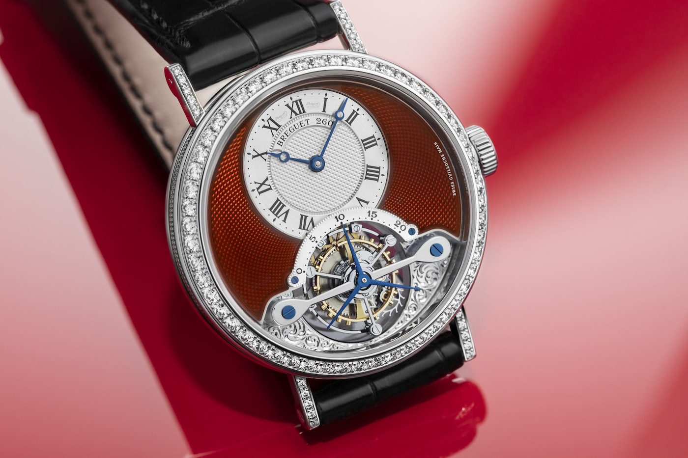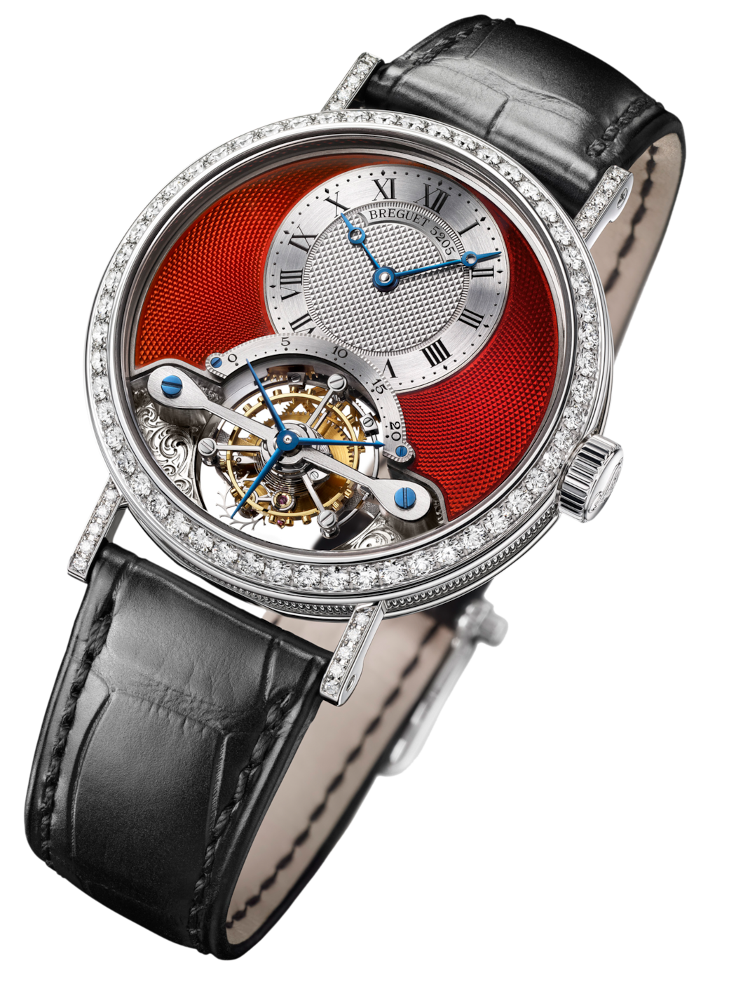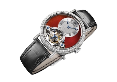 这款直径35毫米的腕表彰显两大亮点——12点钟位置的偏心表盘和6点钟位置的陀飞轮。