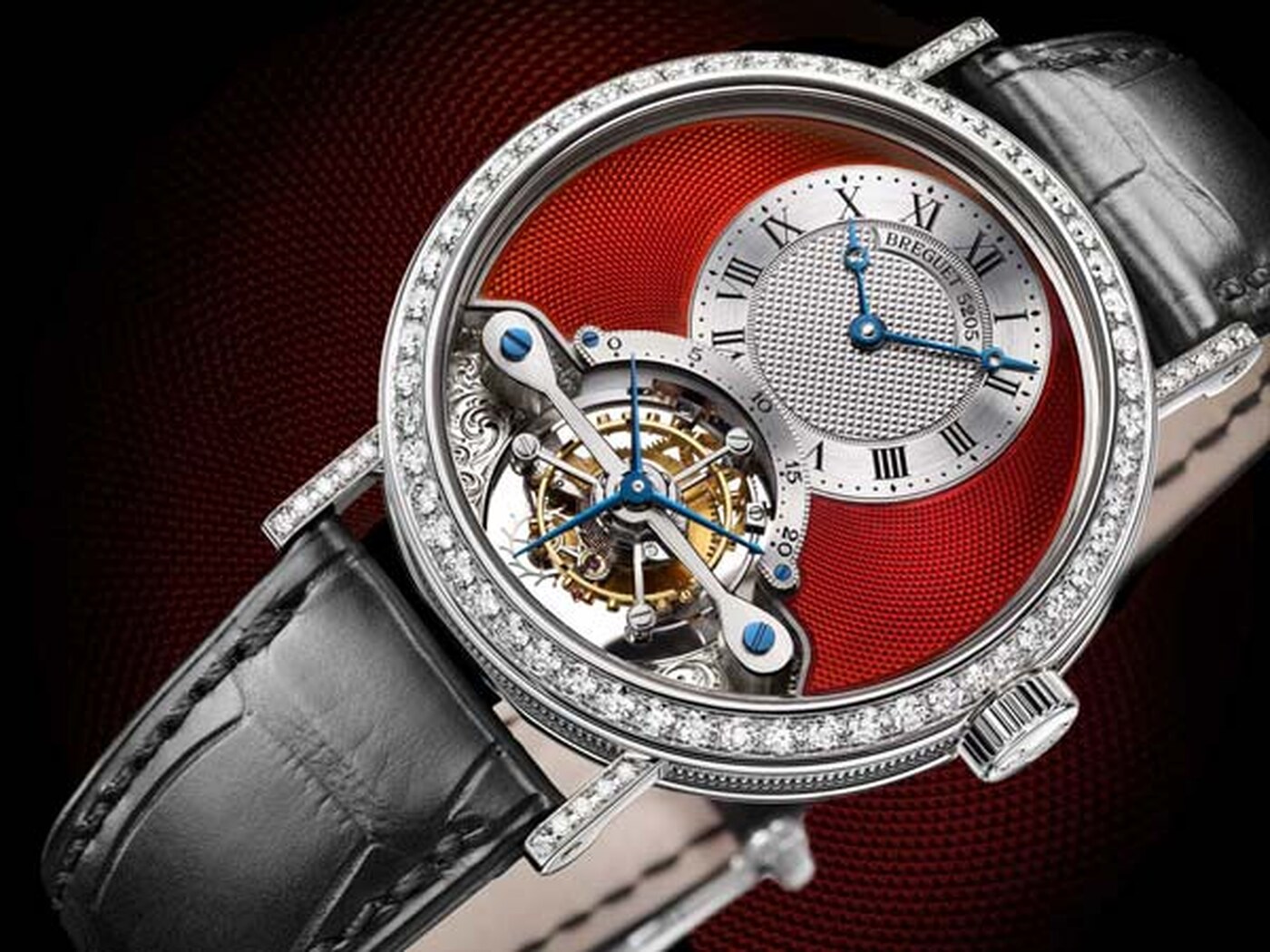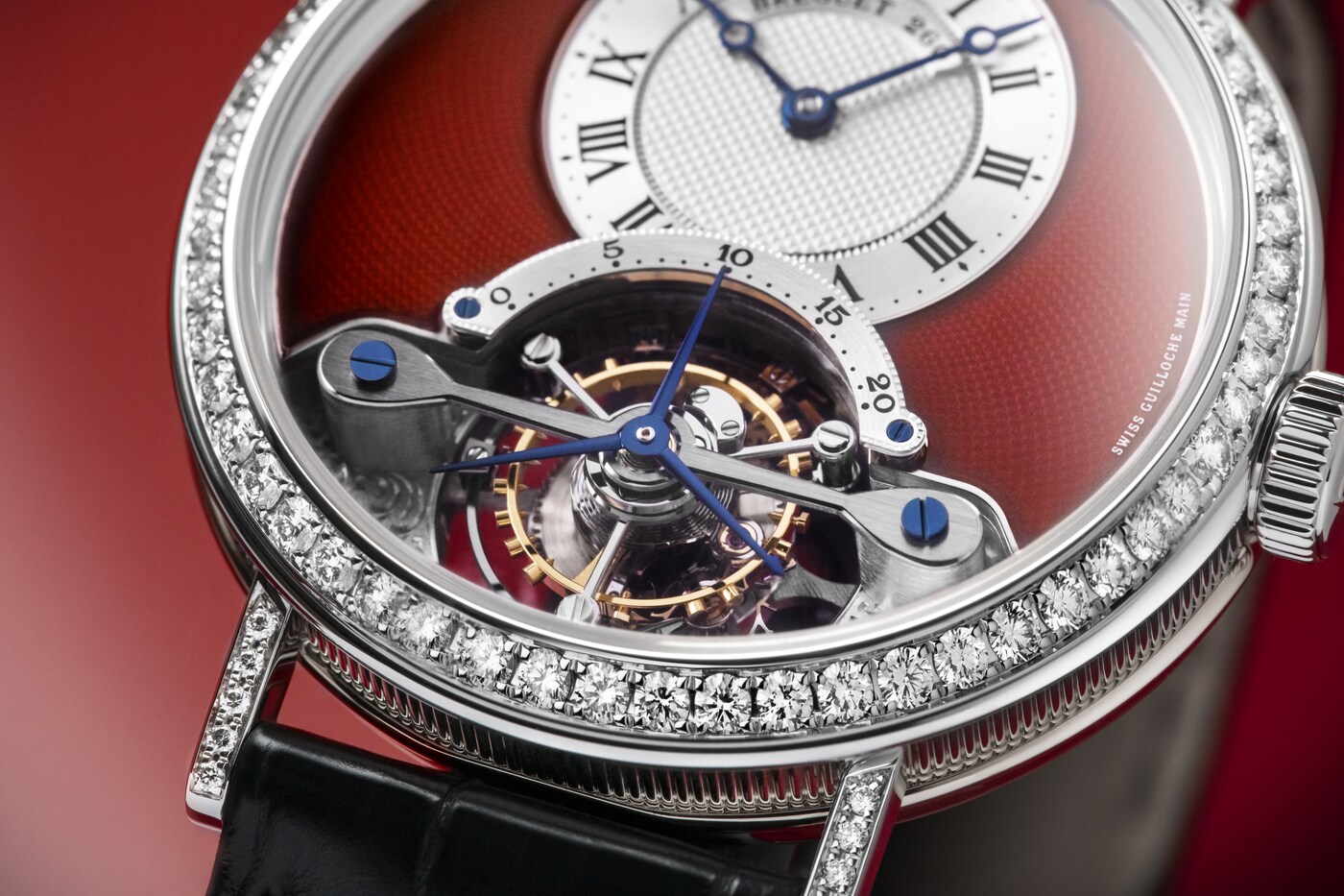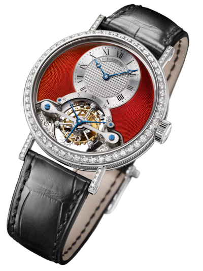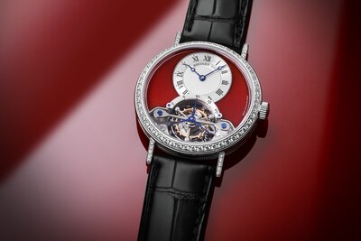 陀飞轮设于大型椭圆弧形视窗内,四周点缀珍珠母贝与璀璨钻石。玫瑰金表款通过白色珍珠母贝小时刻度圈显示时间,中央部分装饰雪花镶嵌钻石。在白色金表款上,繁星散落于珍珠母贝表盘,其上覆以午夜蓝色清漆,宛如迷人星空。陀飞轮前桥点缀雪花镶嵌钻石,仿佛划过夜空的流星。