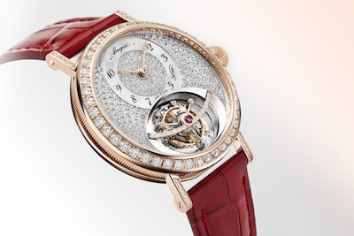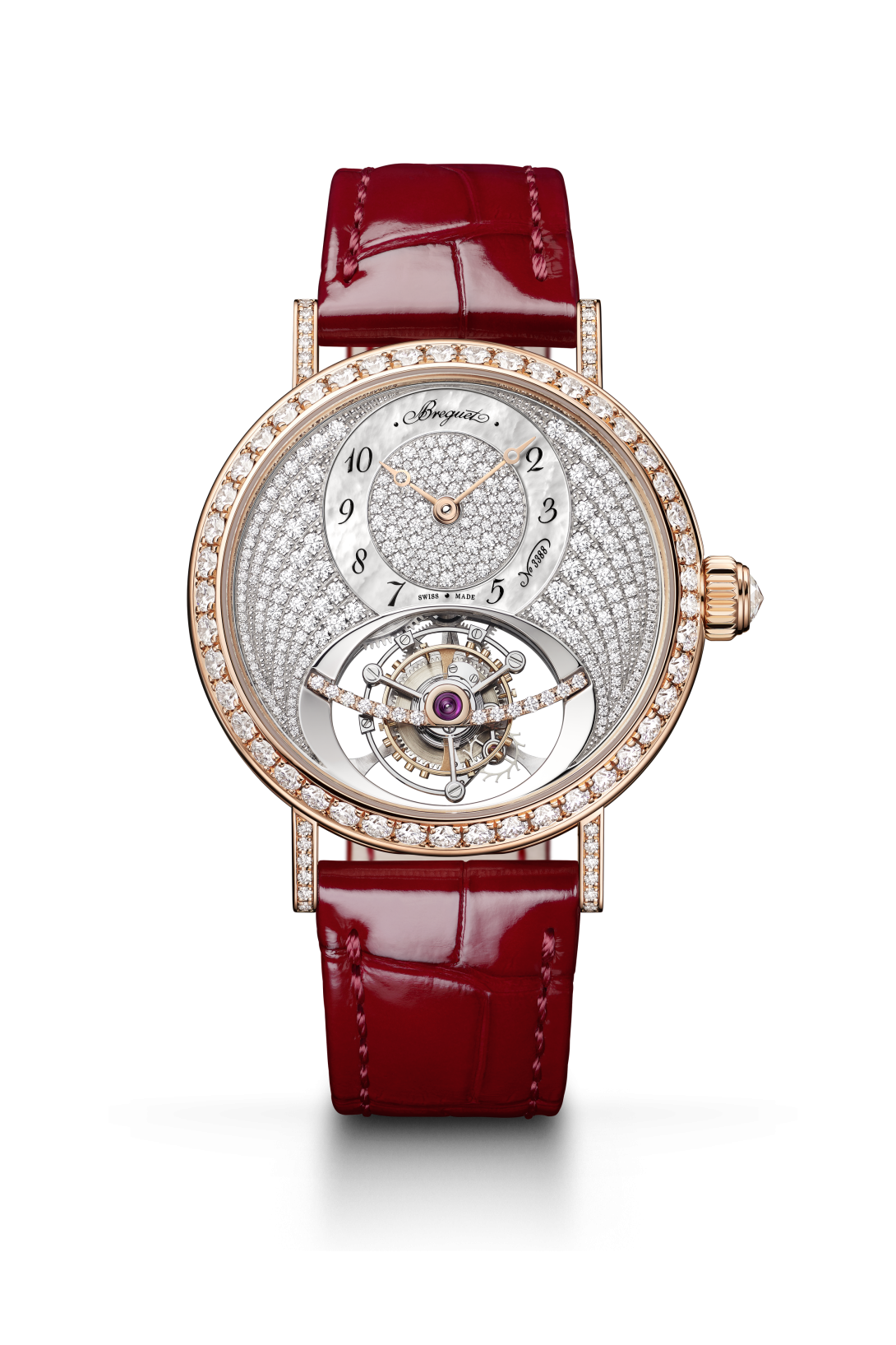 陀飞轮设于大型椭圆弧形视窗内,四周点缀珍珠母贝与璀璨钻石。玫瑰金表款通过白色珍珠母贝小时刻度圈显示时间,中央部分装饰雪花镶嵌钻石。在白色金表款上,繁星散落于珍珠母贝表盘,其上覆以午夜蓝色清漆,宛如迷人星空。陀飞轮前桥点缀雪花镶嵌钻石,仿佛划过夜空的流星。
