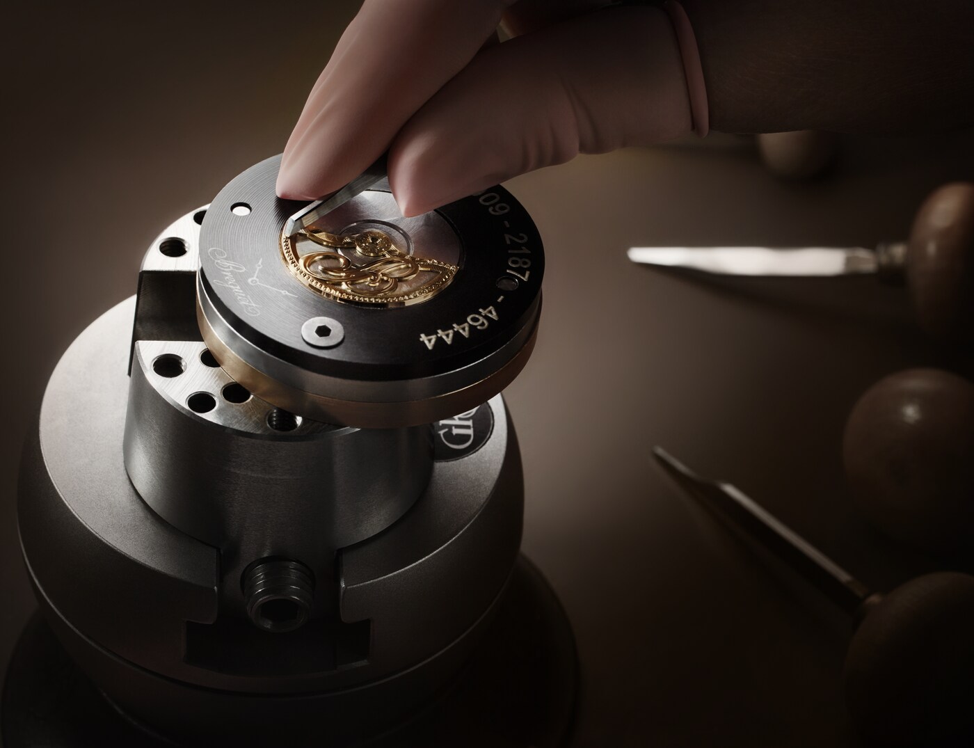 这款腕表的陀飞轮位于6点位置,由自动上链机芯驱动。表壳以金质或铂金打造,金质表盘饰有“巴黎钉纹”(Clous de Paris)玑镂刻花图案。位于12点位置的动力储备显示饰有波浪纹玑镂刻花图案。透过透明底盖,全手工雕刻的精美机芯一览无余。