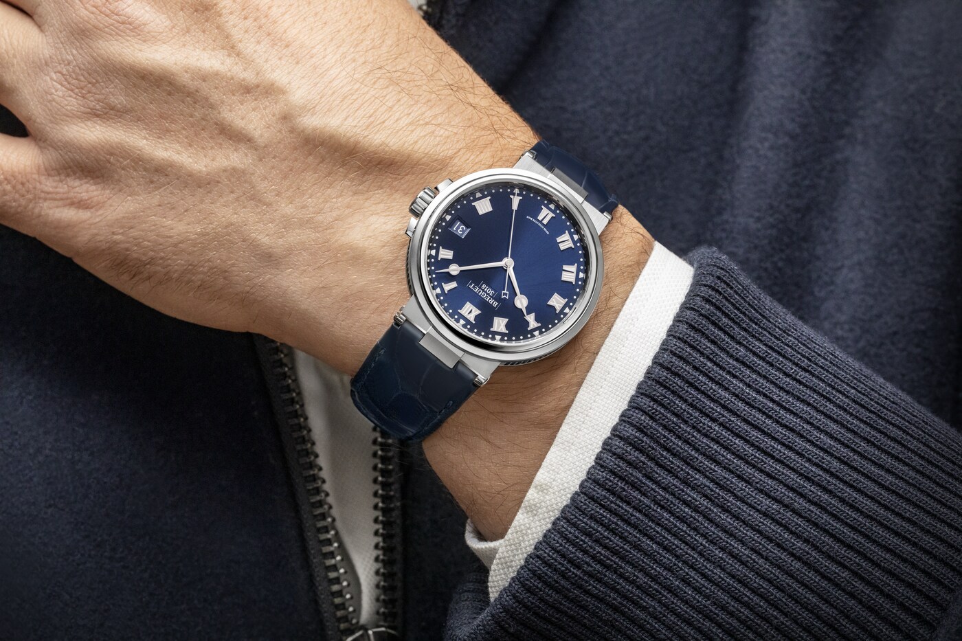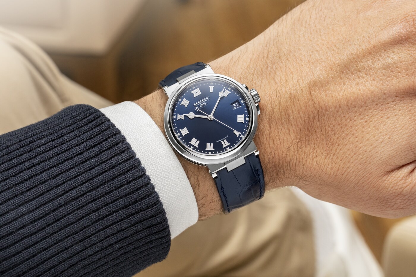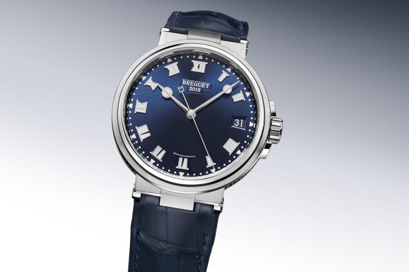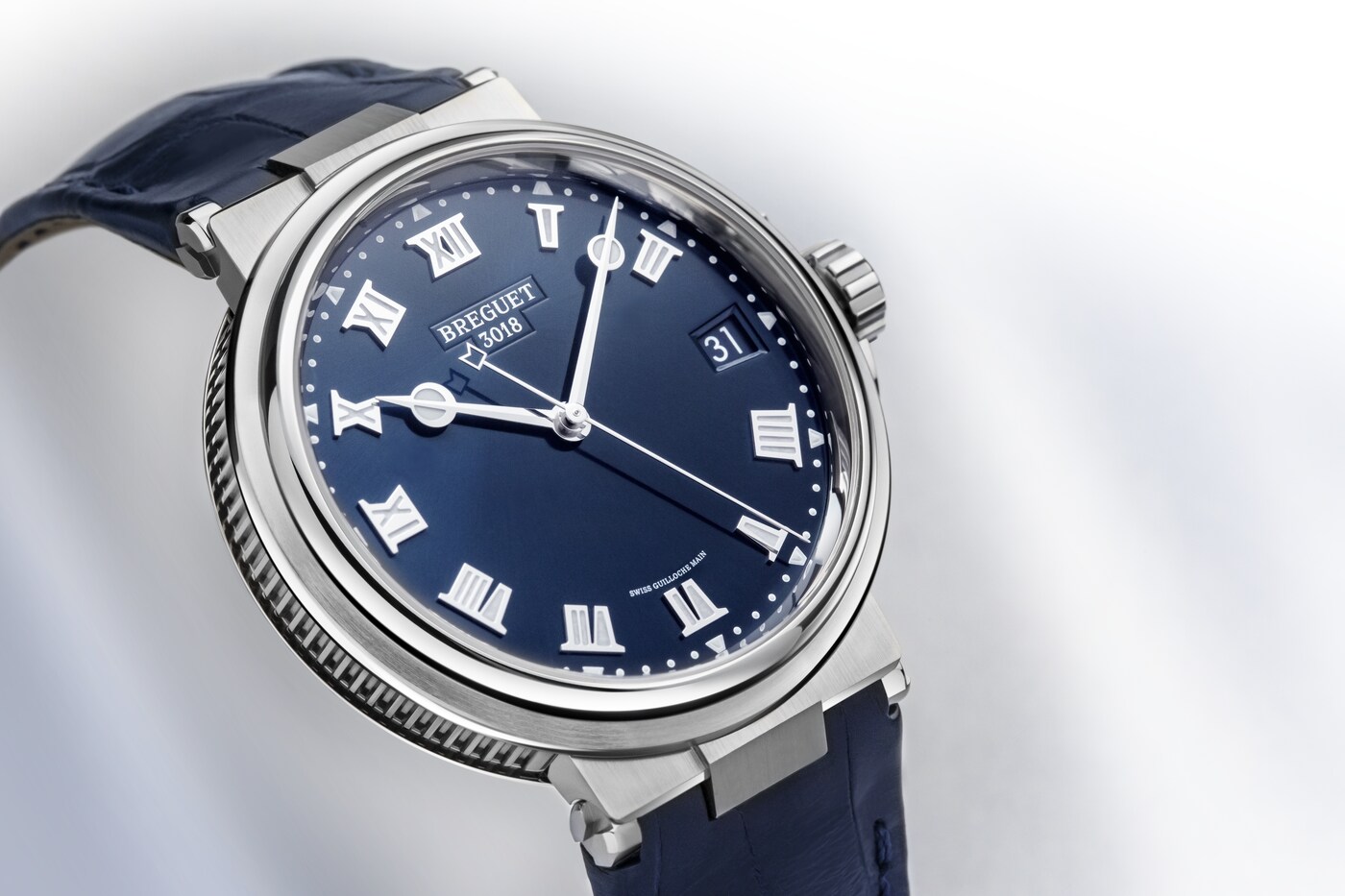 众多丰富细节巧妙呼应Marine航海系列主题。比如,秒针的配重部件设计采用带宝玑首字母“B”的海事信号旗造型。这款腕表直径40毫米,表冠两侧环绕海浪形护桥。透过蓝宝石玻璃透明底盖,精美复杂的自动上链机芯引人瞩目,其摆陀形状令人联想到船舵。