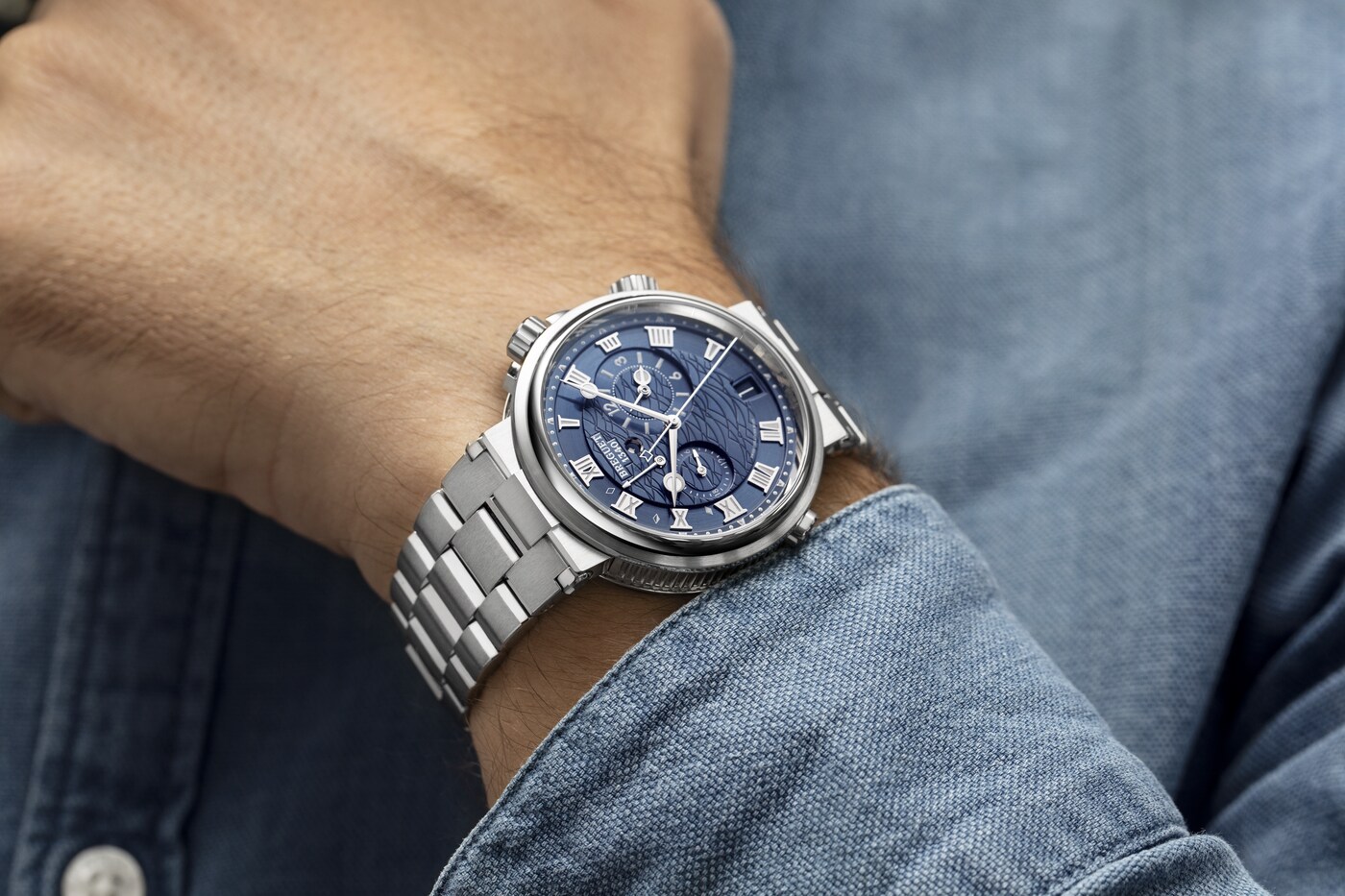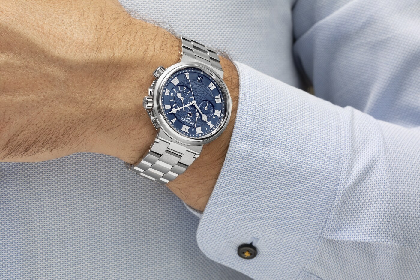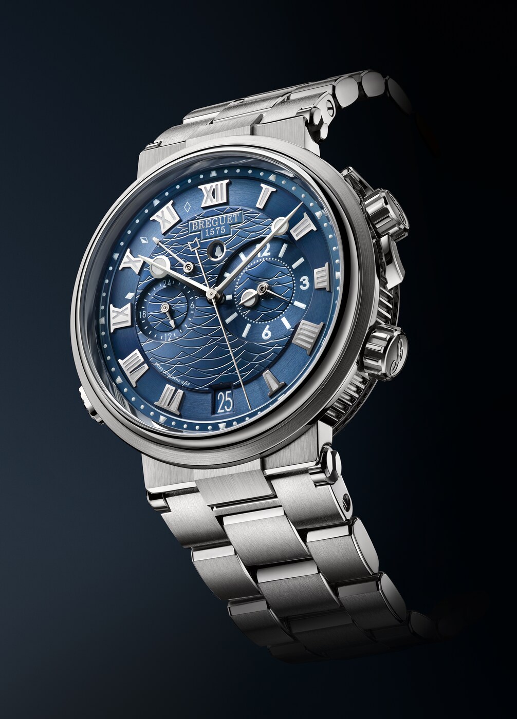 位于3时位置的12小时计时器显示配戴者设定的闹铃时间。闹铃启动时,12时位置的视窗会显示航海钟图案,巧妙致敬此系列的航海主题。腕表的动力储备显示低调地设于9时和12时位置之间。当腕表完全上链时,箭头指向9时位置的颜色区域。第二时区显示同样设于9时位置。指针和标记均采用夜光设计,无论白天还是黑夜都能轻松读时。