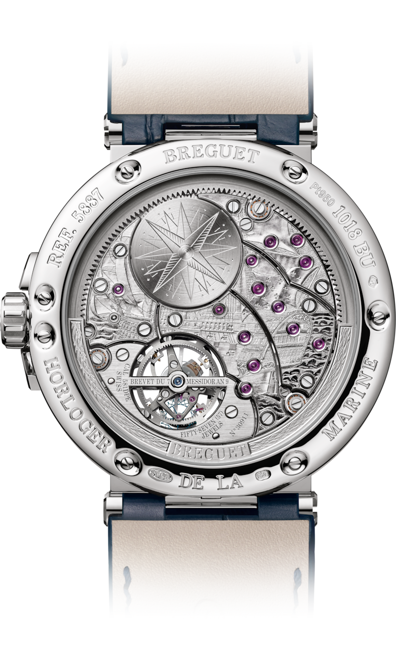 时间等式是宝玑最为珍罕迷人的高级复杂功能之一,能够显示平均太阳时间(“平太阳时”)与真实太阳时间(“真太阳时”)之间的差别。陀飞轮轴心上的时间等式凸轮格外引人瞩目。在Marine航海系列5887腕表上,一枚饰有刻面金色太阳图案的指针用于显示真太阳时的分钟。9点和3点位置之间清晰显示万年历的丰富信息。60秒陀飞轮采用钛金属框架,配备硅质宝玑摆轮游丝。这一创新设计使摆轮振频高达4赫兹,同时为自动上链机芯提供长达80小时的充足动力储备。设于7点与9点之间为80小时动力储备显示窗口。透过蓝宝石玻璃底盖,满覆机芯表桥的精美手工雕刻图案清晰可见。