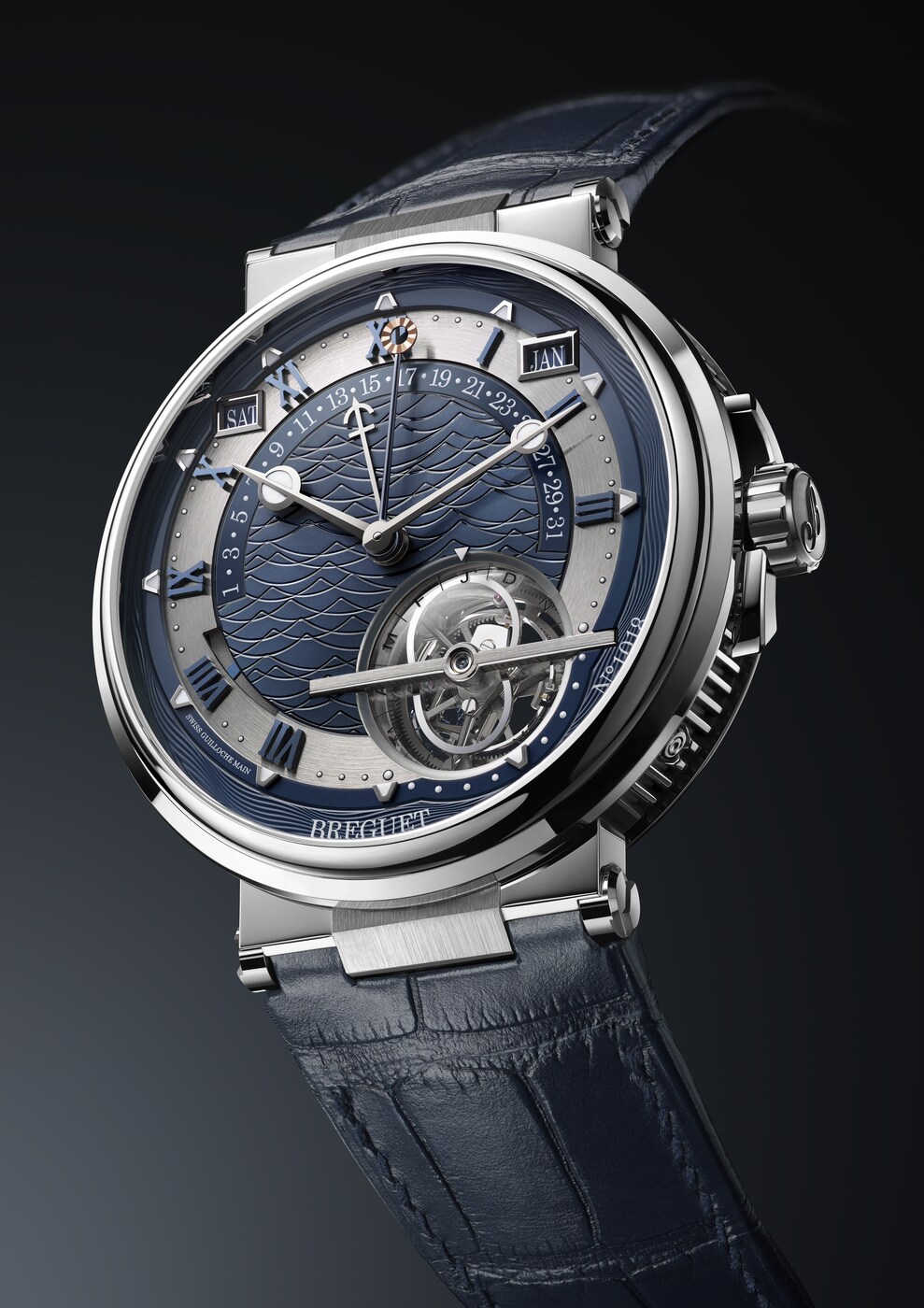 时间等式是宝玑最为珍罕迷人的高级复杂功能之一,能够显示平均太阳时间(“平太阳时”)与真实太阳时间(“真太阳时”)之间的差别。陀飞轮轴心上的时间等式凸轮格外引人瞩目。在Marine航海系列5887腕表上,一枚饰有刻面金色太阳图案的指针用于显示真太阳时的分钟。9点和3点位置之间清晰显示万年历的丰富信息。60秒陀飞轮采用钛金属框架,配备硅质宝玑摆轮游丝。这一创新设计使摆轮振频高达4赫兹,同时为自动上链机芯提供长达80小时的充足动力储备。设于7点与9点之间为80小时动力储备显示窗口。透过蓝宝石玻璃底盖,满覆机芯表桥的精美手工雕刻图案清晰可见。