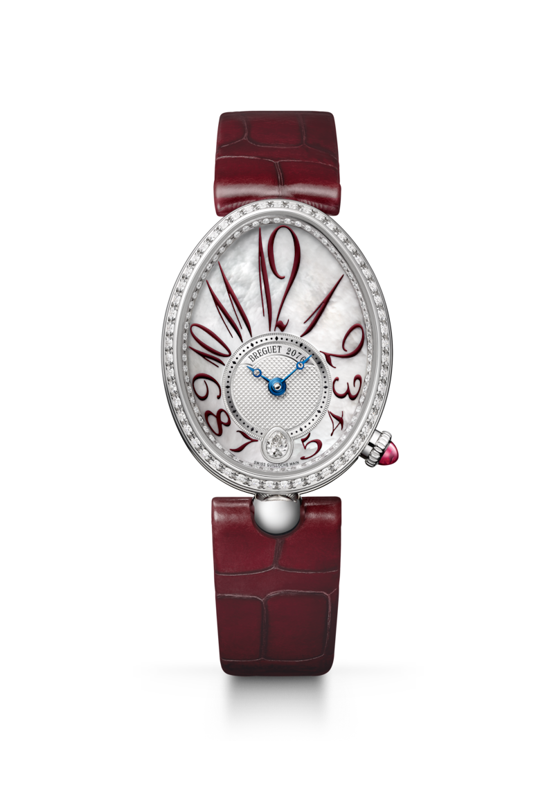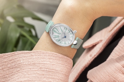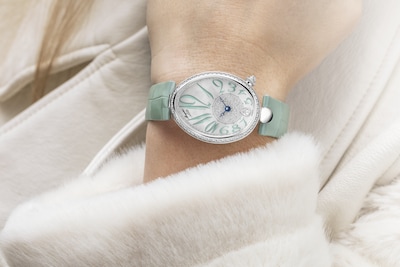 这款腕表的独特之处在于采用夸张放大的宝玑数字时标,巧妙分布于表盘之上,将刻度圈围绕其中。