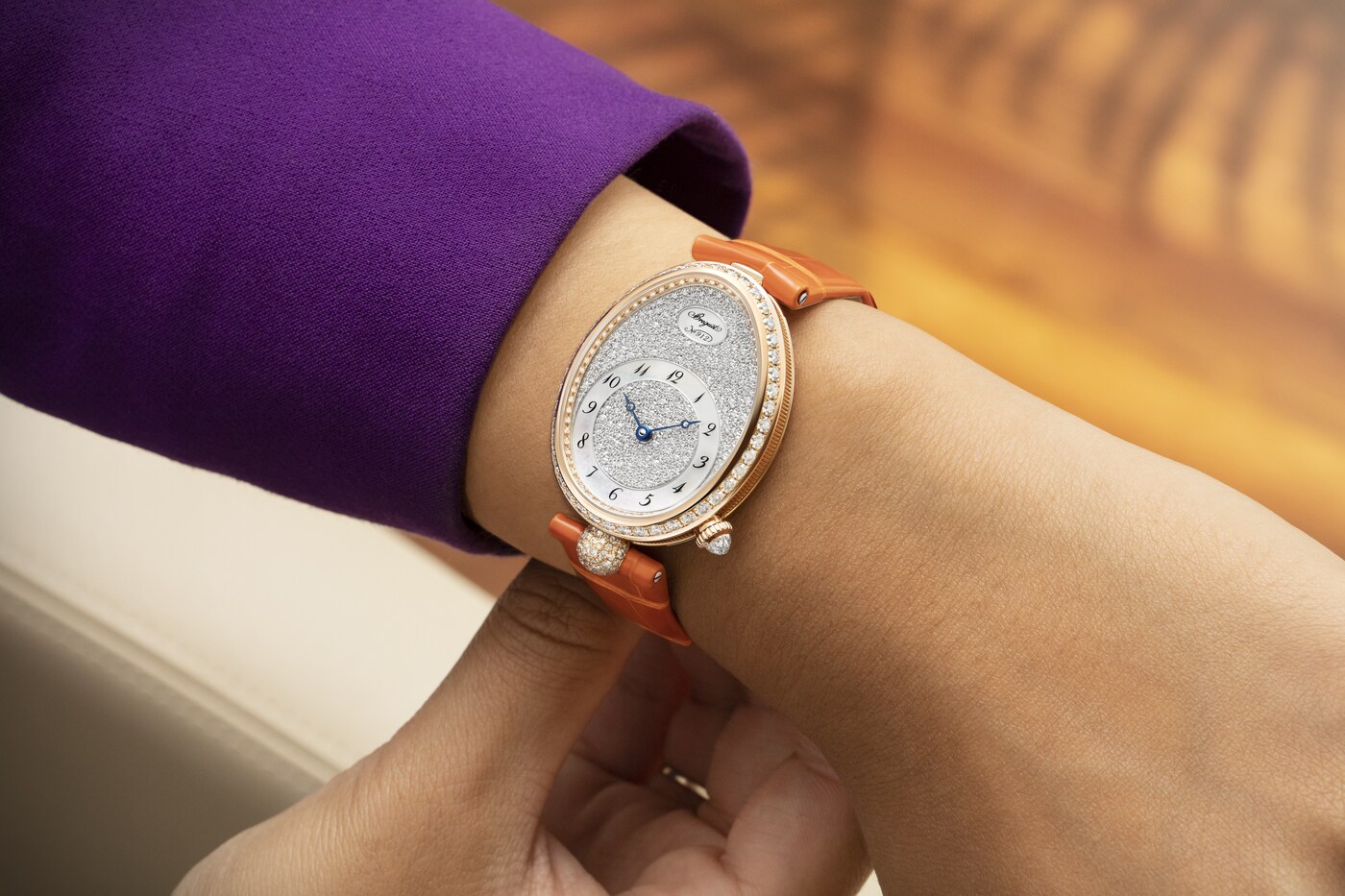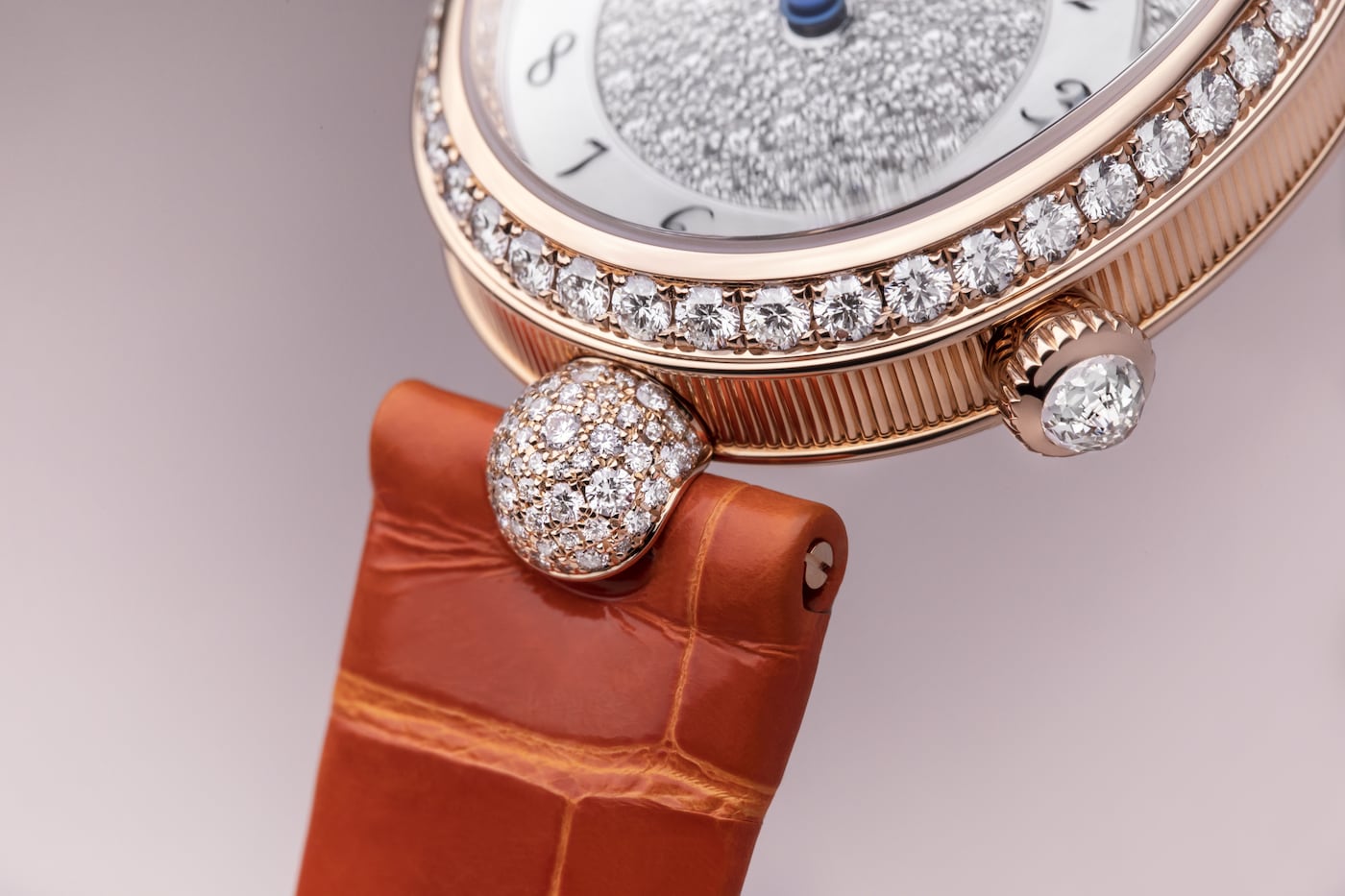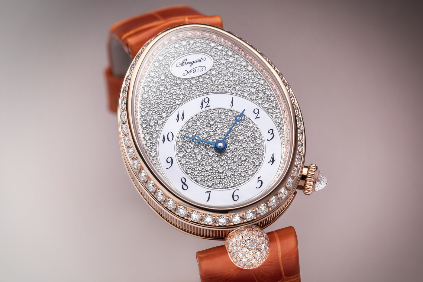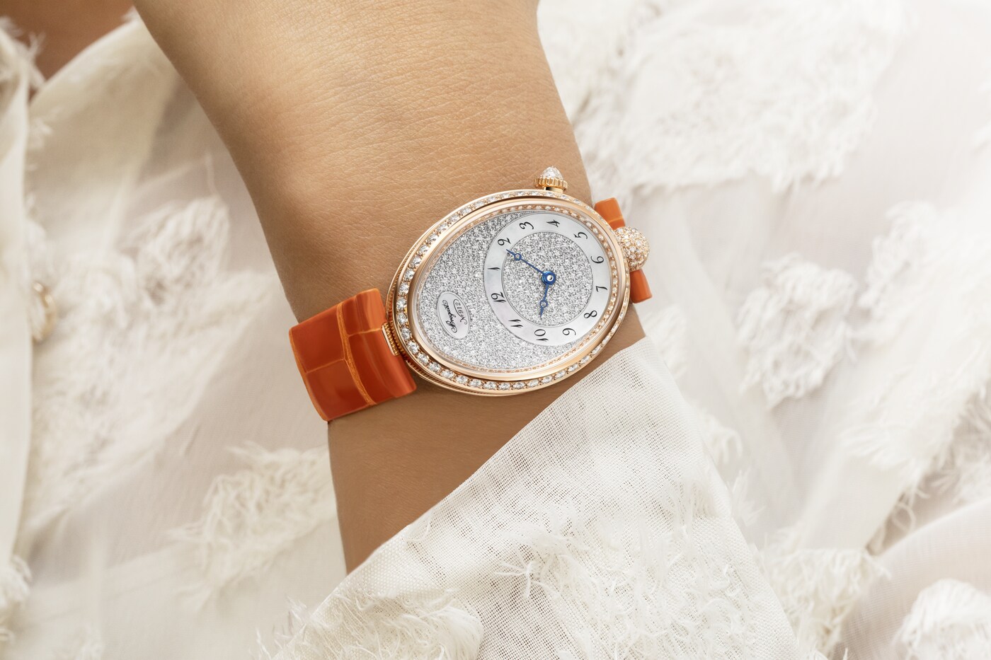 此镶嵌工艺巧妙排布大小不一的钻石,将镶嵌底座隐匿于钻石的闪耀光芒之下。表盘搭配白色珍珠母贝刻度圈,以及传统宝玑蓝钢指针,更显华美动人。