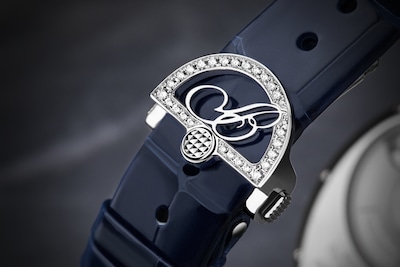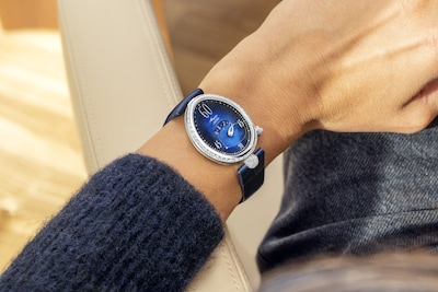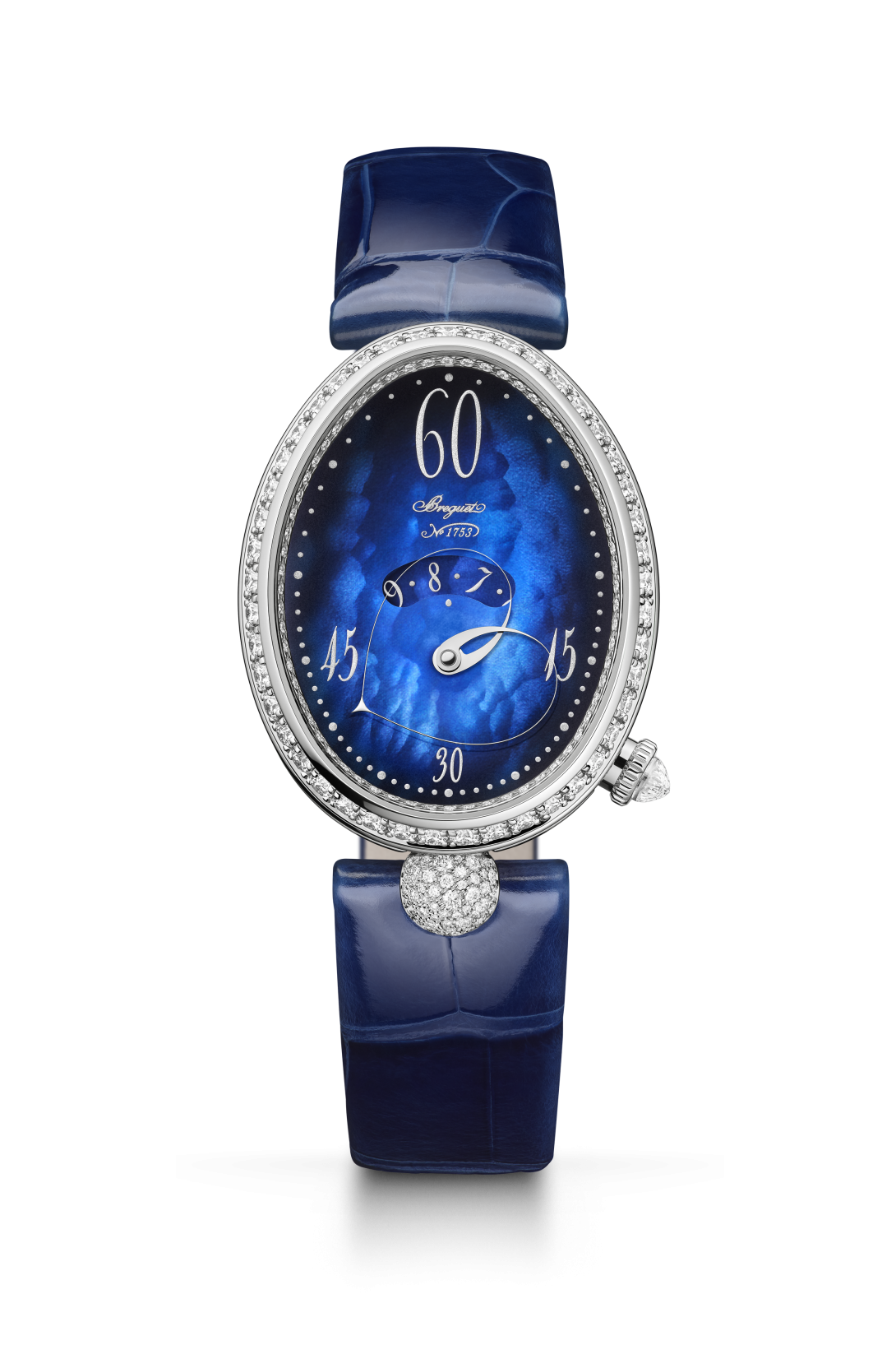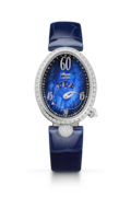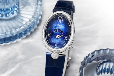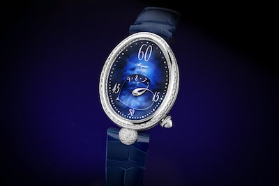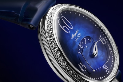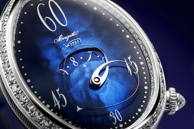 Au bénéfice de plusieurs brevets, ce mécanisme est signé Breguet. La longueur variable de l’aiguille permettant d’indiquer les minutes est composée de deux bras liés à l’extrémité supérieure, mais indépendants l’un de l’autre. Ces derniers se déforment grâce à un astucieux jeu d’engrenages. L’aiguille s’amuse ainsi avec le cadran en affichant des formes différentes lorsqu’elle est étirée à 12 heures, ou arrondie à 6 heures. Côté esthétique, ce modèle possède une boîte en or blanc qui contraste élégamment avec son cadran en nacre bleu nuit et dont les teintes subtiles varient en fonction de la lumière. Son réhaut, sa lunette et son attache sont sertis de 161 diamants. Sa couronne affiche un diamant briolette, quant à sa boucle déployante, elle est décorée de 28 diamants. Ce garde-temps est limité à 20 pièces.