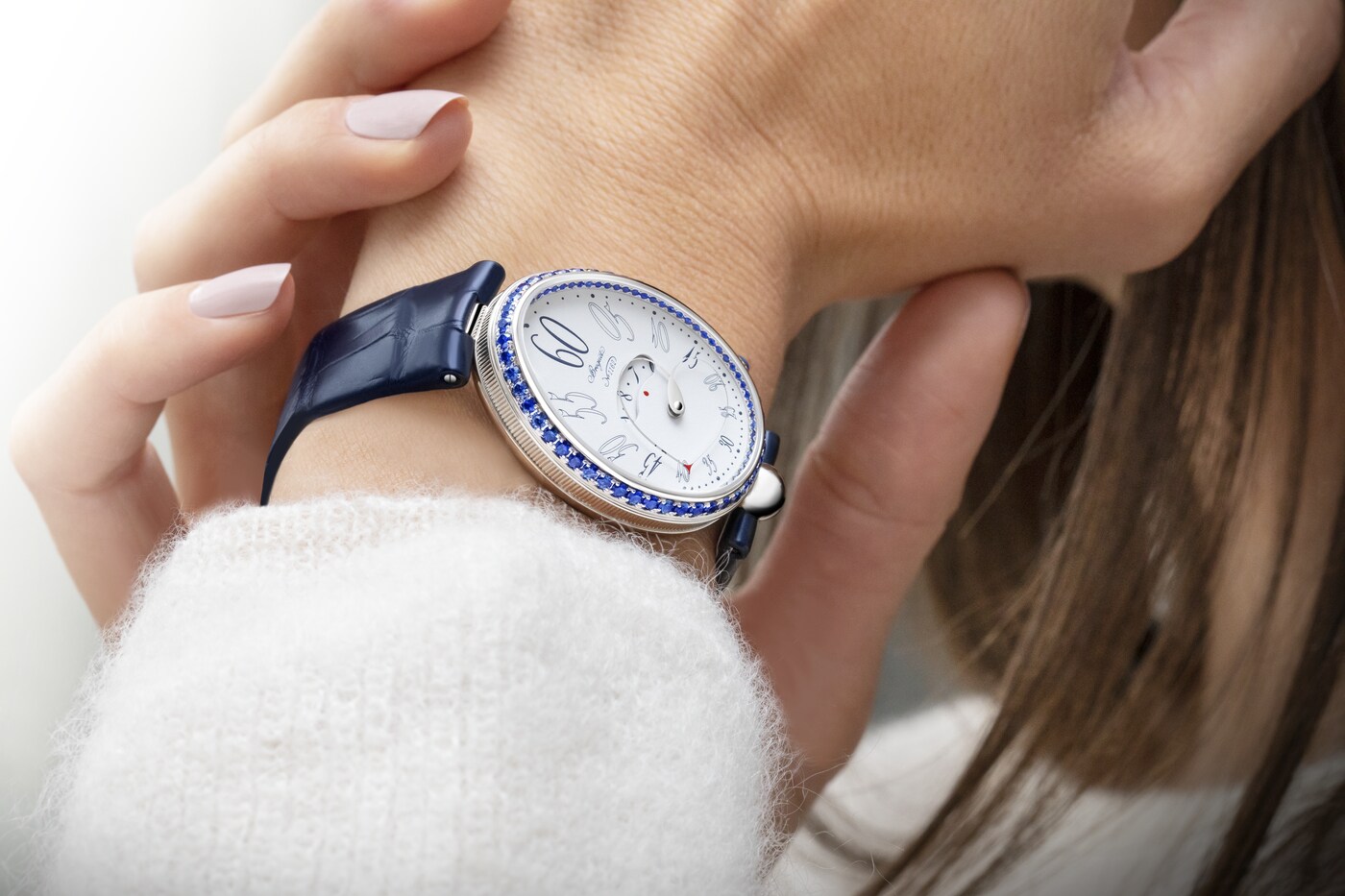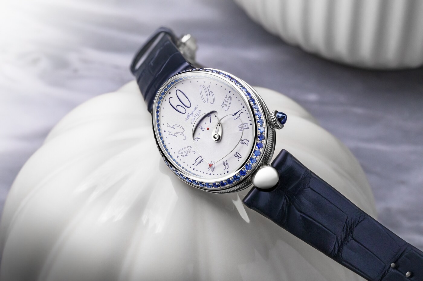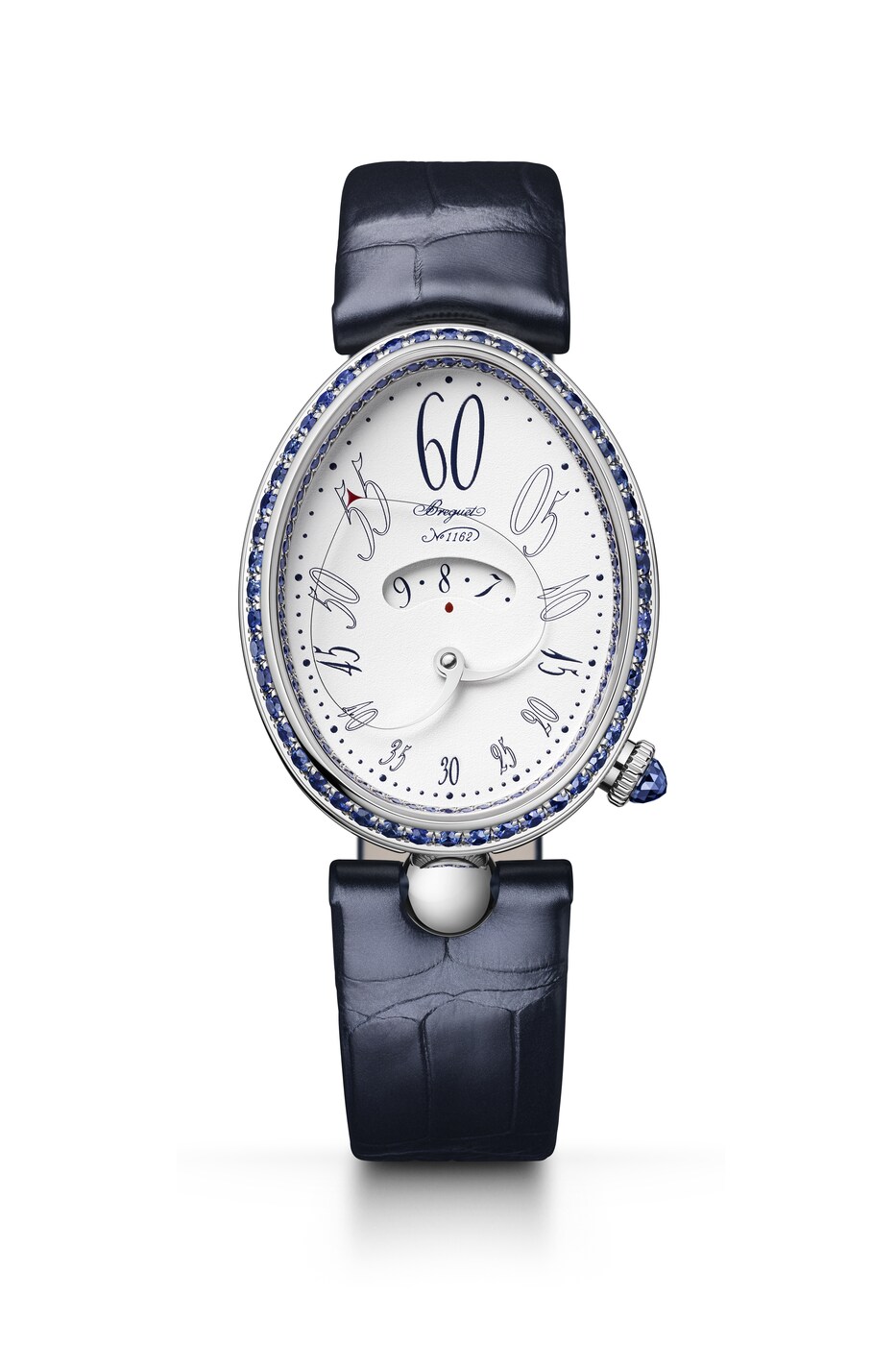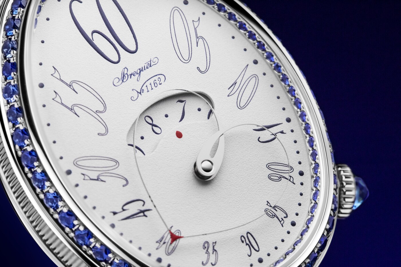 形状可变的分针由两根相交于表盘中央的指针臂组成。在12点钟位置时显得舒展,而在6点钟位置时则聚拢得更为圆润。由此,指针与表盘的形状巧妙呼应、相映成趣。这一装置拥有多项专利,是宝玑的独创发明之一。分钟与小时显示相辅相成,后者可通过表盘中央的显示窗读取。阿拉伯数字时标采用转印工艺,别致字体令人联想到手绘艺术。