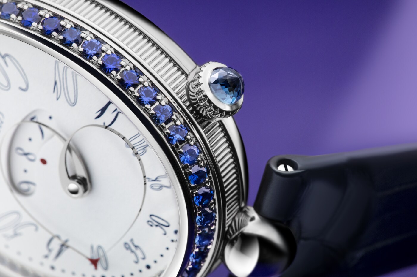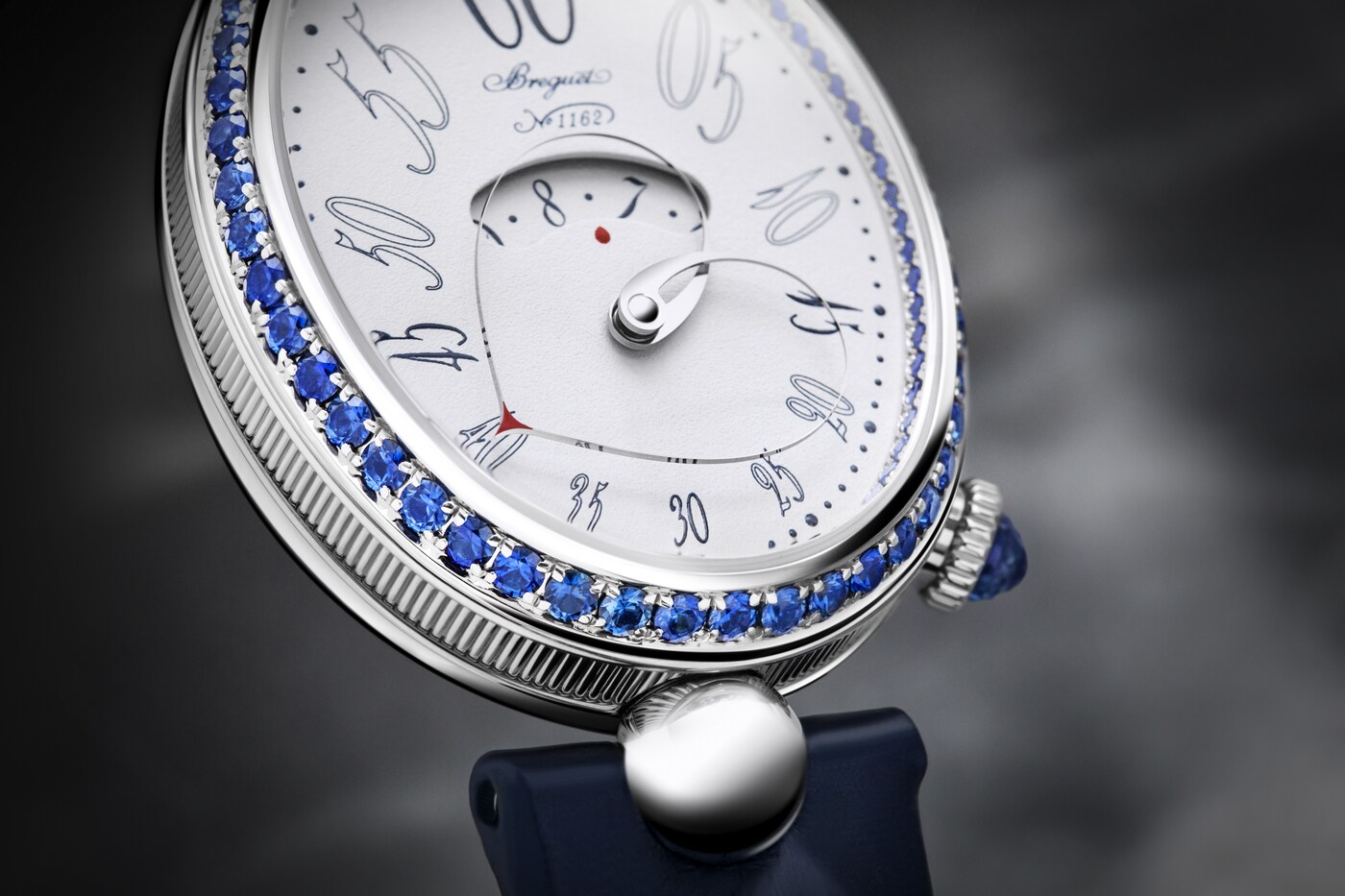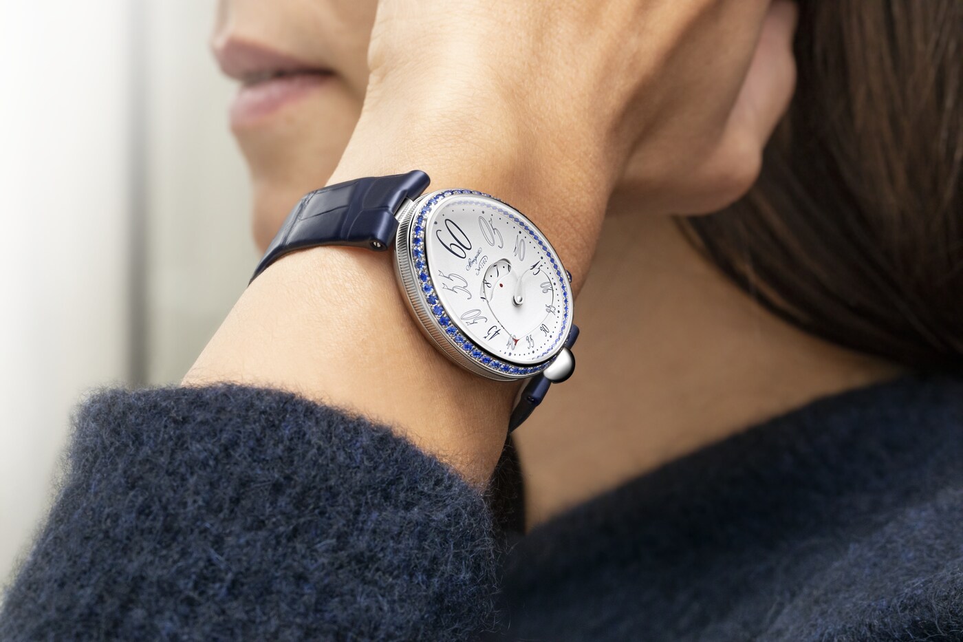 形状可变的分针由两根相交于表盘中央的指针臂组成。在12点钟位置时显得舒展,而在6点钟位置时则聚拢得更为圆润。由此,指针与表盘的形状巧妙呼应、相映成趣。这一装置拥有多项专利,是宝玑的独创发明之一。分钟与小时显示相辅相成,后者可通过表盘中央的显示窗读取。阿拉伯数字时标采用转印工艺,别致字体令人联想到手绘艺术。