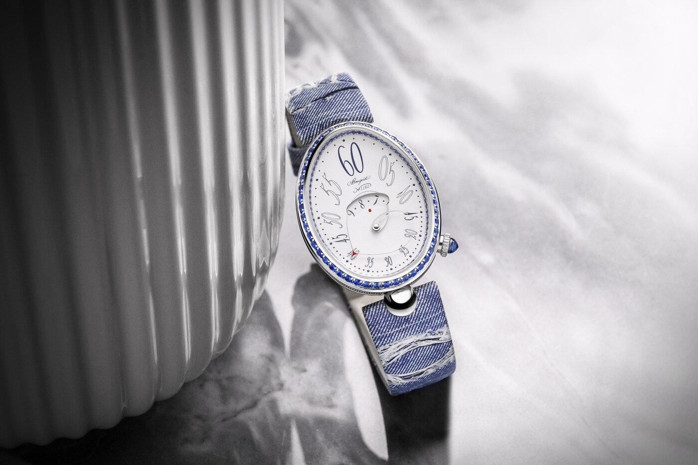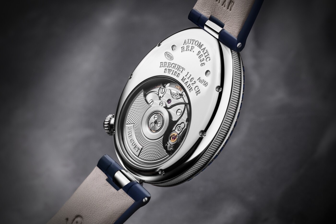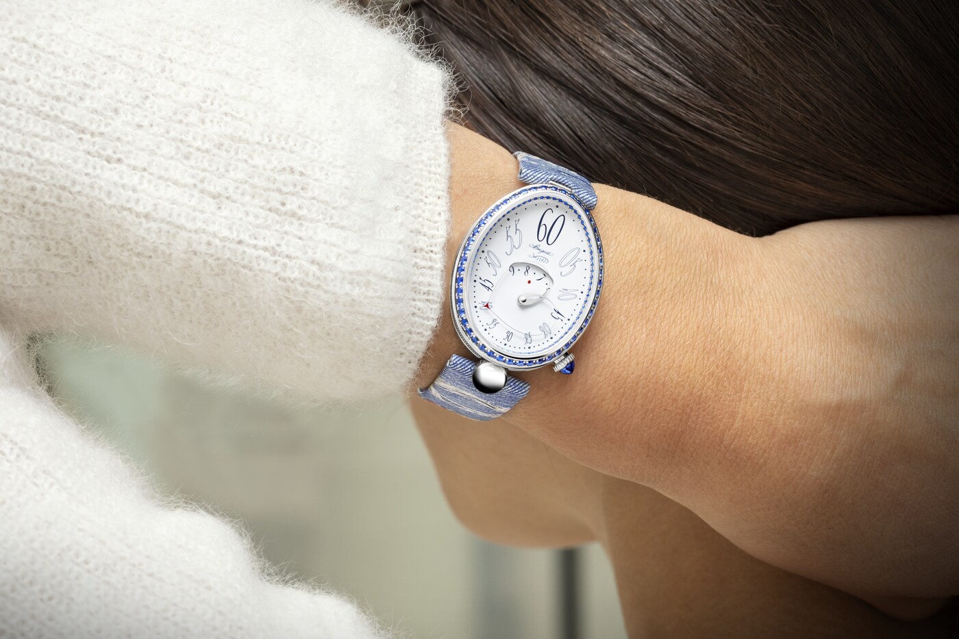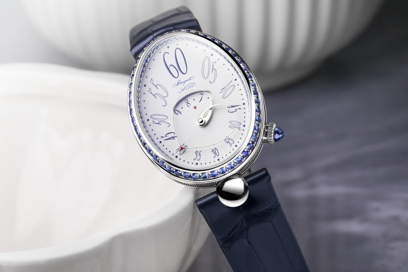 形状可变的分针由两根相交于表盘中央的指针臂组成。在12点钟位置时显得舒展,而在6点钟位置时则聚拢得更为圆润。由此,指针与表盘的形状巧妙呼应、相映成趣。这一装置拥有多项专利,是宝玑的独创发明之一。分钟与小时显示相辅相成,后者可通过表盘中央的显示窗读取。阿拉伯数字时标采用转印工艺,别致字体令人联想到手绘艺术。