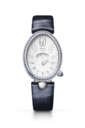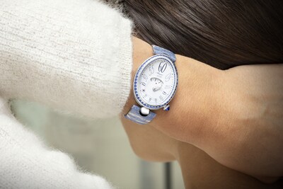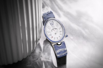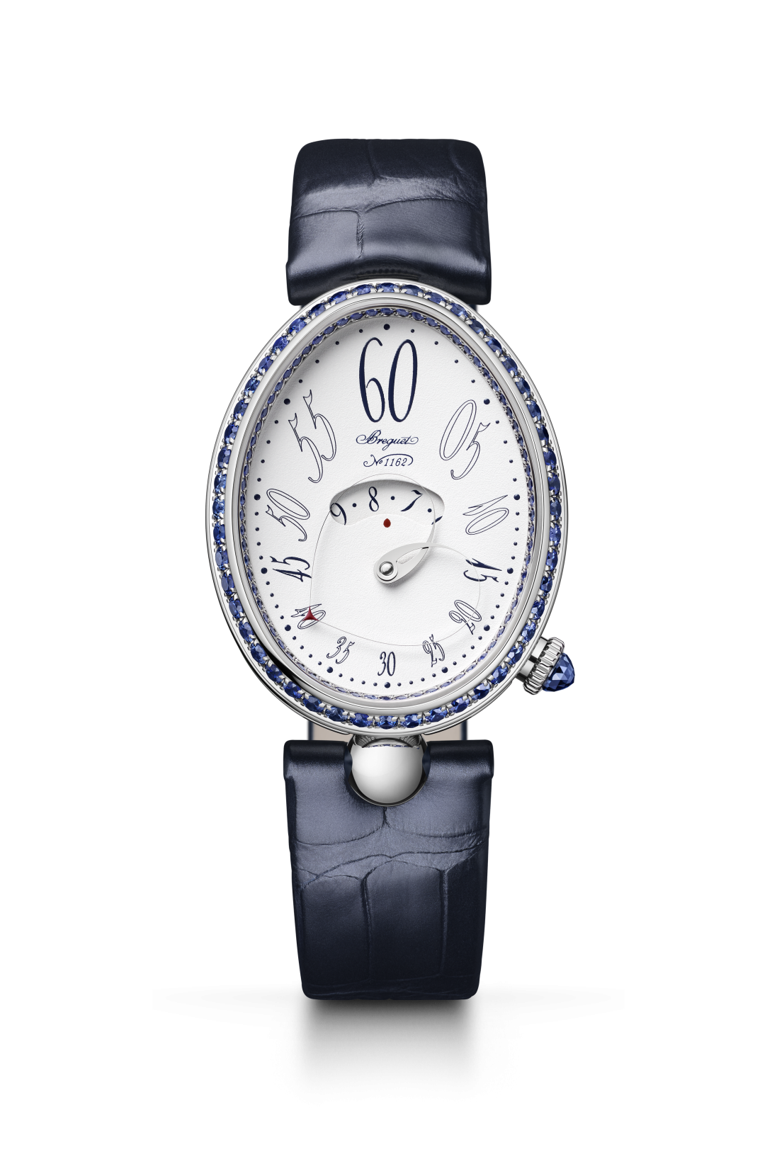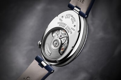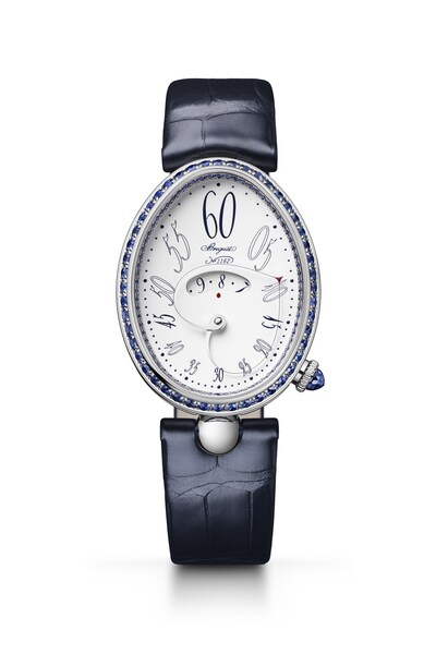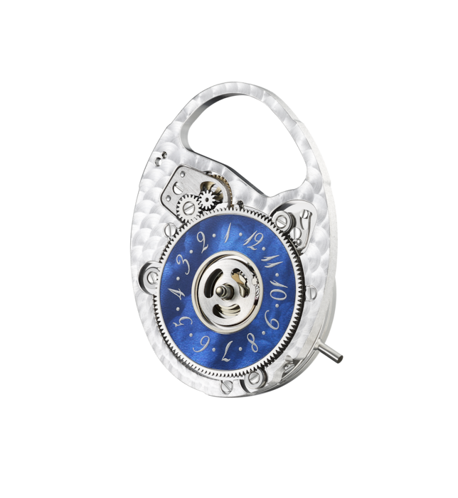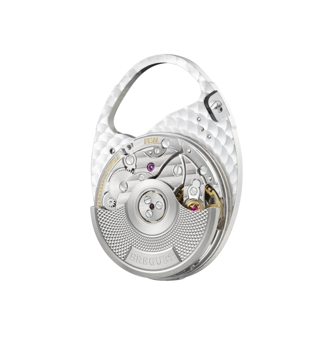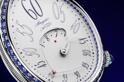 Composée de deux bras qui se rejoignent au centre, l’aiguille s’amuse avec le cadran en affichant des formes différentes lorsqu’elle est étirée à 12h ou plus arrondie à 6h. Elle épouse ainsi parfaitement la forme du cadran. Au bénéfice de plusieurs brevets, ce mécanisme est une création signée Breguet. L’affichage des minutes est complété par l’heure qui se lit dans un guichet situé au centre du cadran. Les chiffres arabes, à la typographie rappelant un dessin réalisé à la main, sont décalquées.