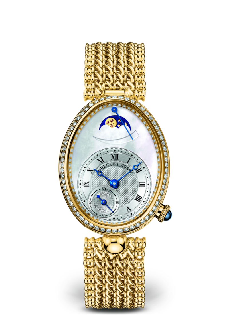 这款腕表重新演绎品牌史上首款手镯式腕表的经典元素,即月相显示和动力储存显示。