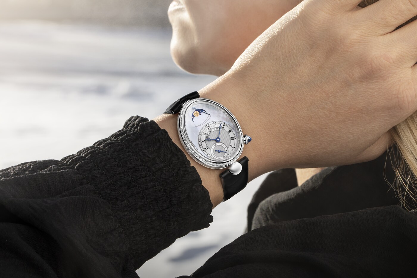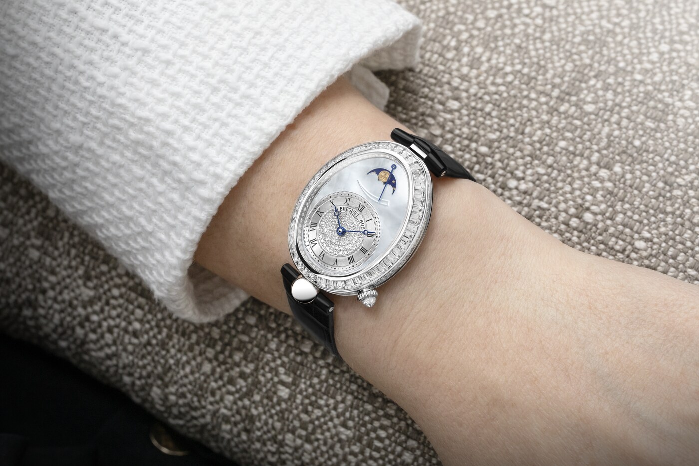 与原型表款一样,Reine de Naples那不勒斯王后系列8909腕表配备月相显示和动力储存显示功能。镀银金质偏心刻度圈位于6点位置,表盘中央和外缘均镶嵌明亮式切割钻石,表冠亦镶嵌华美钻石。