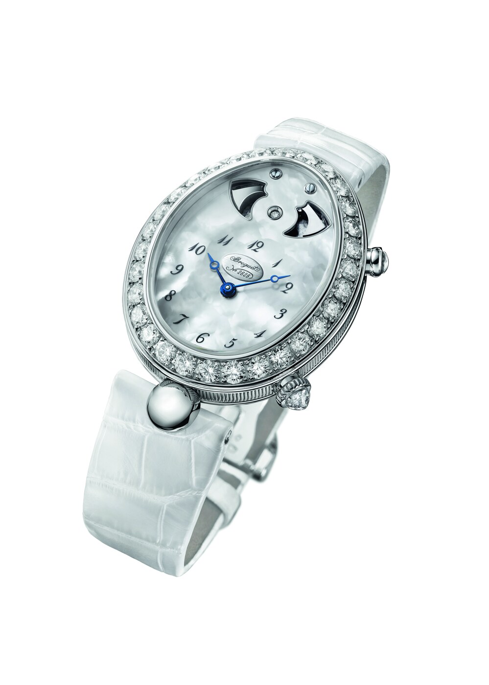 位于2点位置的按钮,可轻松开启或关闭自鸣报时功能。腕表搭载宝玑表厂自制的椭圆形机芯,经手工雕刻并润饰。在美学方面,白色金表壳搭配白色珍珠母贝表盘,表圈镶满璀璨钻石,美轮美奂。表盘顶部的11点和1点位置分别设有一枚音锤,音锤之间则镶嵌一颗钻石,用以显示自鸣报时功能是否处于开启状态。在腕表背面,机芯、摆陀和表背的精致雕刻构成了一副瑞鸟展翅的景象,分外别致迷人。