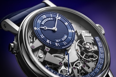 除了偏心表盘上指示时、分的传统宝玑指针外,此款腕表还配备另一枚结构独特的指针。它在垂直平面上巧妙弯曲,更显层次分明,能够在机芯部件上方,乃至3点和9点位置之间的区域流畅运转。这枚指针具备逆跳功能,能够在月末瞬时返回“1”的位置。阿伯拉罕-路易·宝玑正是最早完善逆跳日期功能的制表先驱之一,此功能也为他的多款传世杰作增添别样魅力。