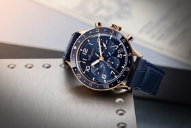 腕表所搭载的机芯尽显对宝玑精准计时的严苛追求,致敬伟大的航空渊源。与此同时,表款外观精致考究,散发独特 美感。玫瑰金表壳与深蓝色表盘以及蓝色陶瓷表圈形成鲜明对比。阿拉伯数字时标和指针均以金质打造。