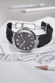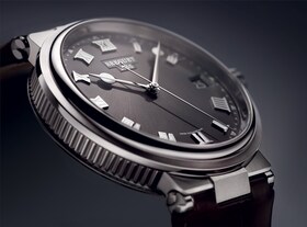 Marine航海系列的罗马数字时标和指针别具一格。整体切割时标大胆醒目,搭配更为现代的宝玑 指针。指针和时标覆以夜光涂层。